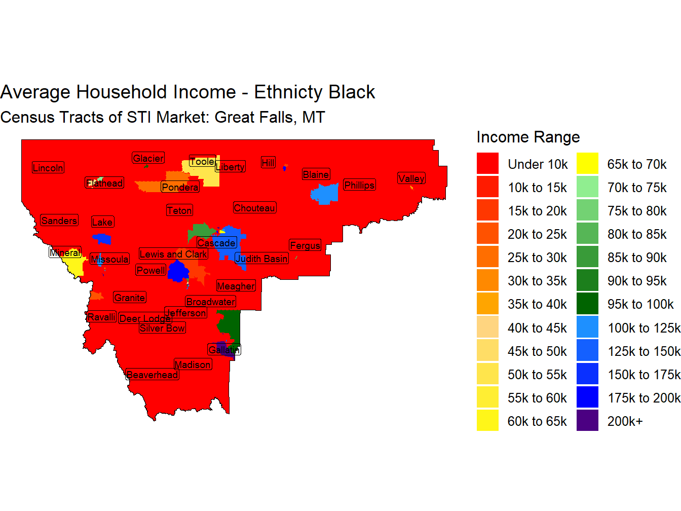 With an Average Household Income for those head of householders identifying as Non-Hispanic Black of $99,953 the Great Falls, MT market ranks 31st across STI Markets.