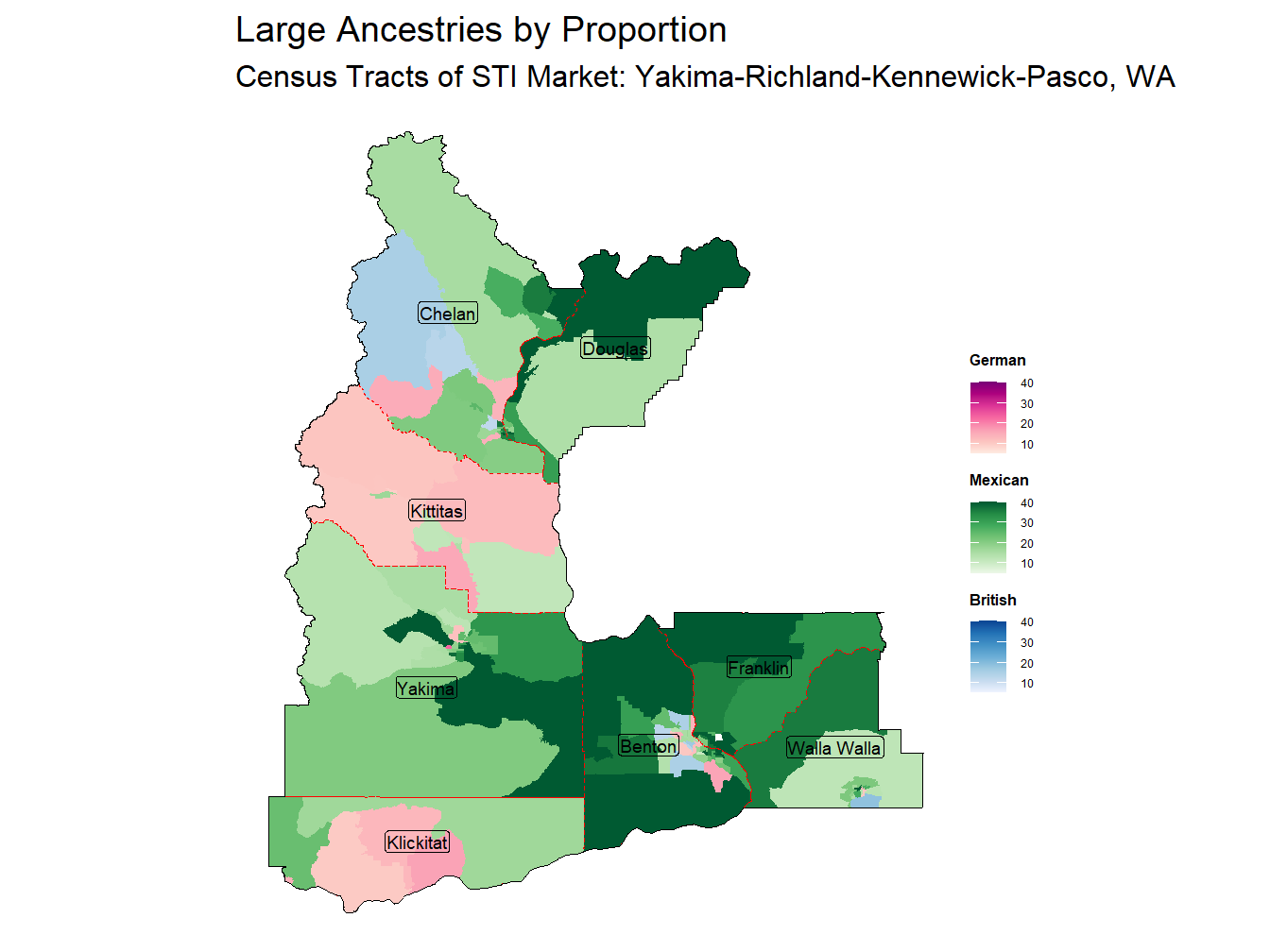 Large ancestries in the Yakima-Richland-Kennewick-Pasco, WA Market include Mexican, German, and British . These ancestries make up 32.4%, 7.1%, and 5.7% of the total population, respectively. When comparing to national proportions, the Mexican ancestry is the most notable with a location quotient of 2.87 the proportion of this ancestry ranks 15th across STI Markets.