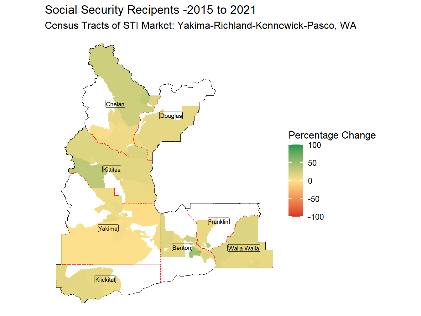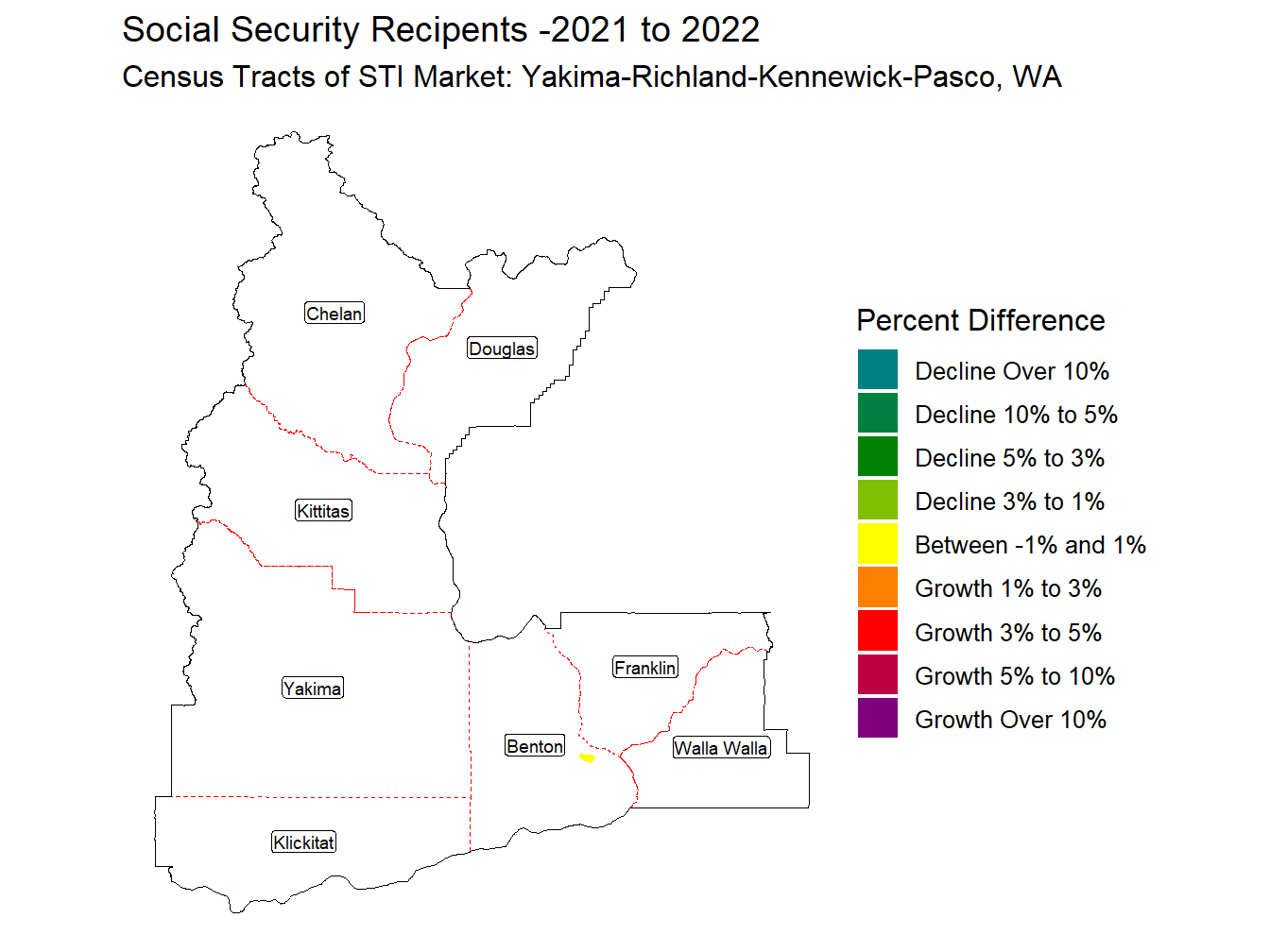 In the Yakima-Richland-Kennewick-Pasco, WA Market, 155,384 out of the Population of 845,839, 18.4%, receive some type of Social Security benefit. This is 0.99 times the National proportion of Social Security Recipients of 18.6%. The market ranks 124th across STI Markets in the proportion of Social Security recipients.