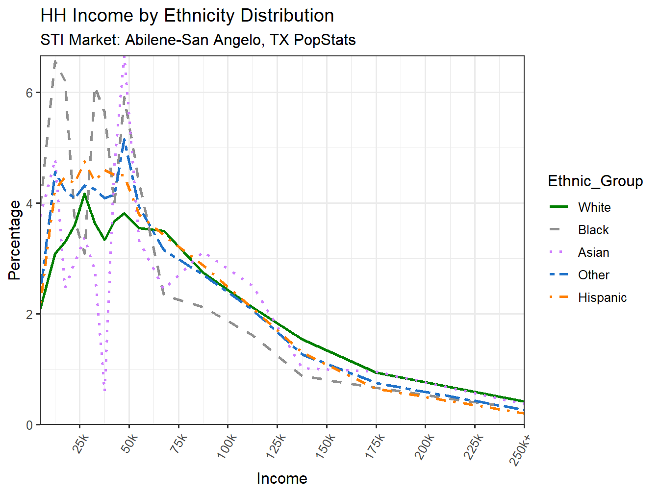 Below the multi-colored line represents the same data for household income in the Abilene-San Angelo, TX market, but more equally lays out the distribution of population versus the income level, correcting for differences in size of income ranges. You will also notice that after 200k the income ranges are scaled down so the focus is more centered on the more numerous Households making under 200k. The black line represents the National Income Distribution for comparison.