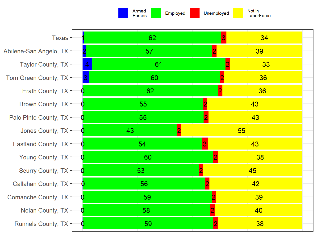The Abilene-San Angelo, TX ranks 106th in labor force participation among the 167 STI Markets with 60.4% of those 16 plus in the labor force. Of those in the Labor force 2.78% are in the Armed Forces a value 3.51 times the national average resulting in an Armed Forces employment ranking of 18th across STI Markets.