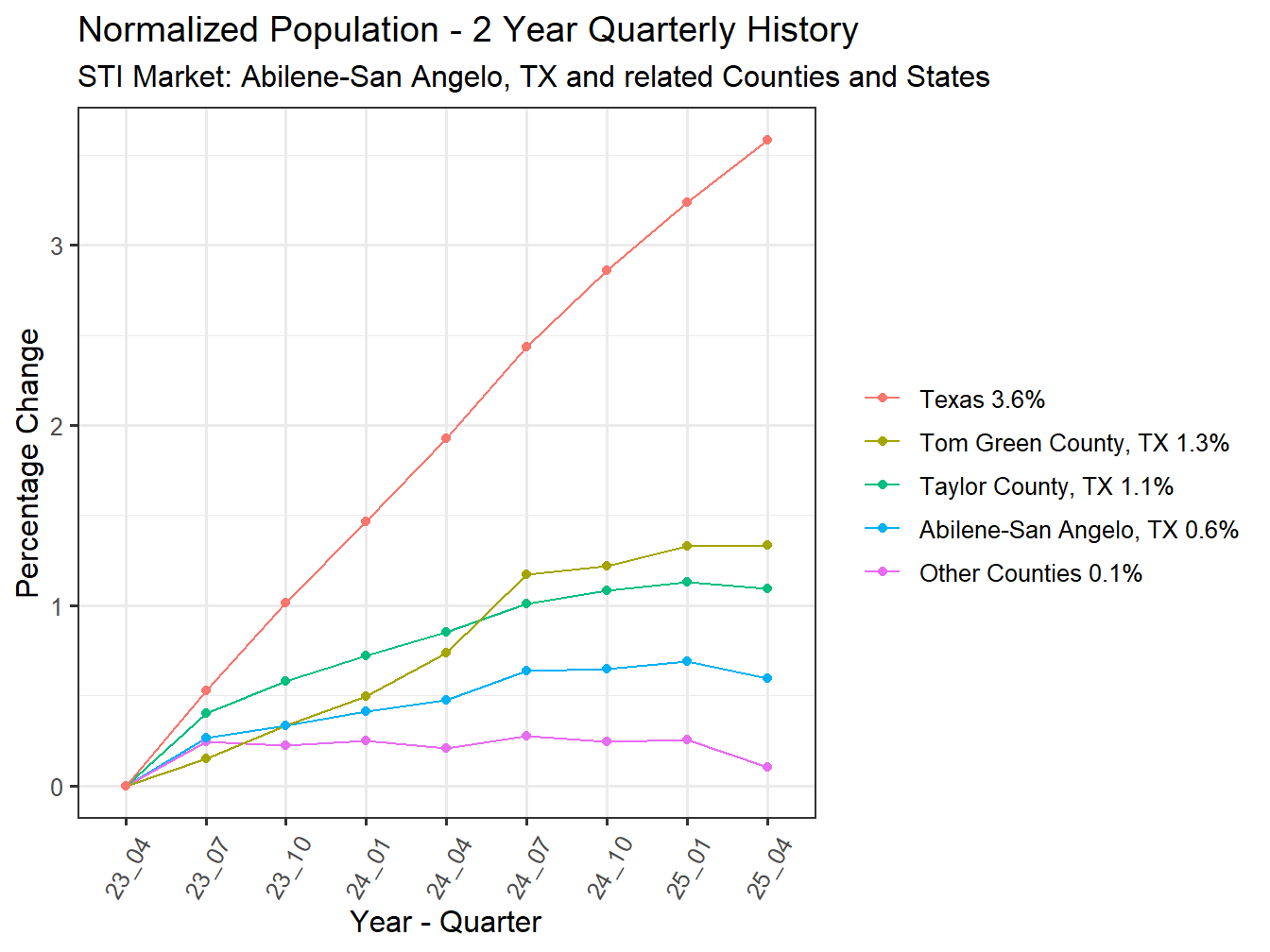 With a 2 Year Compound Annual Growth Rate (CAGR) of 0.3% the Abilene-San Angelo, TX Market is growing. It ranks 96th in 2 year population change across all STI Markets.
