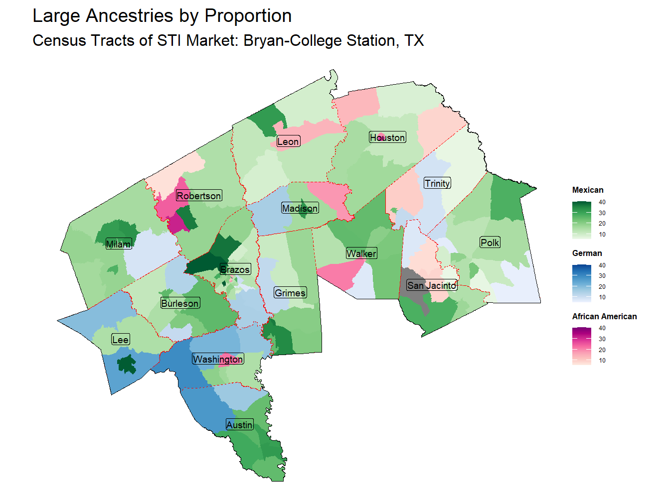 Large ancestries in the Bryan-College Station, TX Market include Mexican, African American, and German . These ancestries make up 19.6%, 7.7%, and 6.9% of the total population, respectively. When comparing to national proportions, the Mexican ancestry is the most notable with a location quotient of 1.73 the proportion of this ancestry ranks 26th across STI Markets.