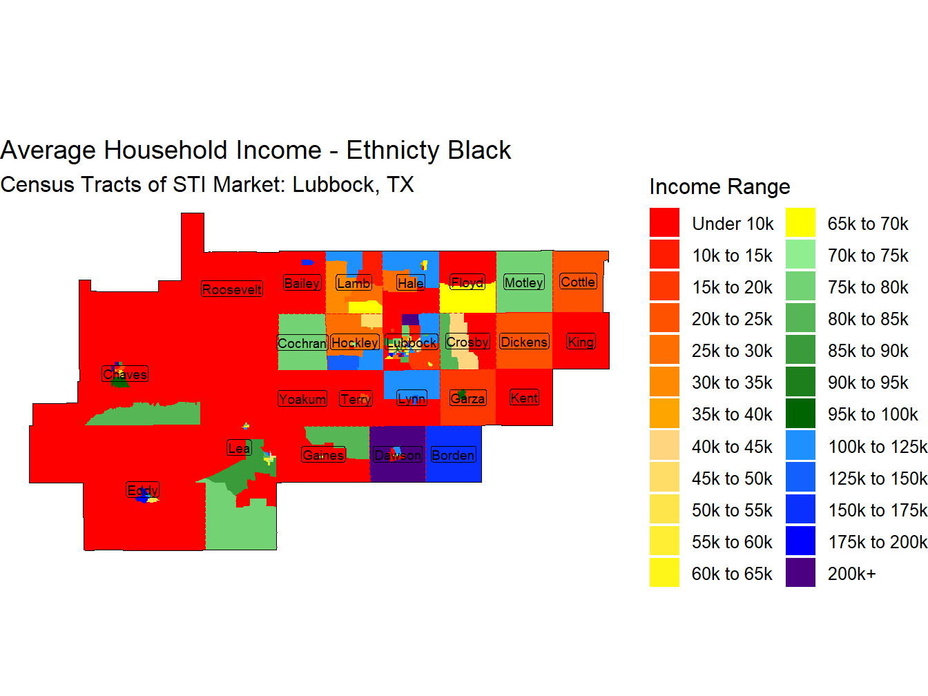 With an Average Household Income for those head of householders identifying as Non-Hispanic Black of $67,133 the Lubbock, TX market ranks 131st across STI Markets.