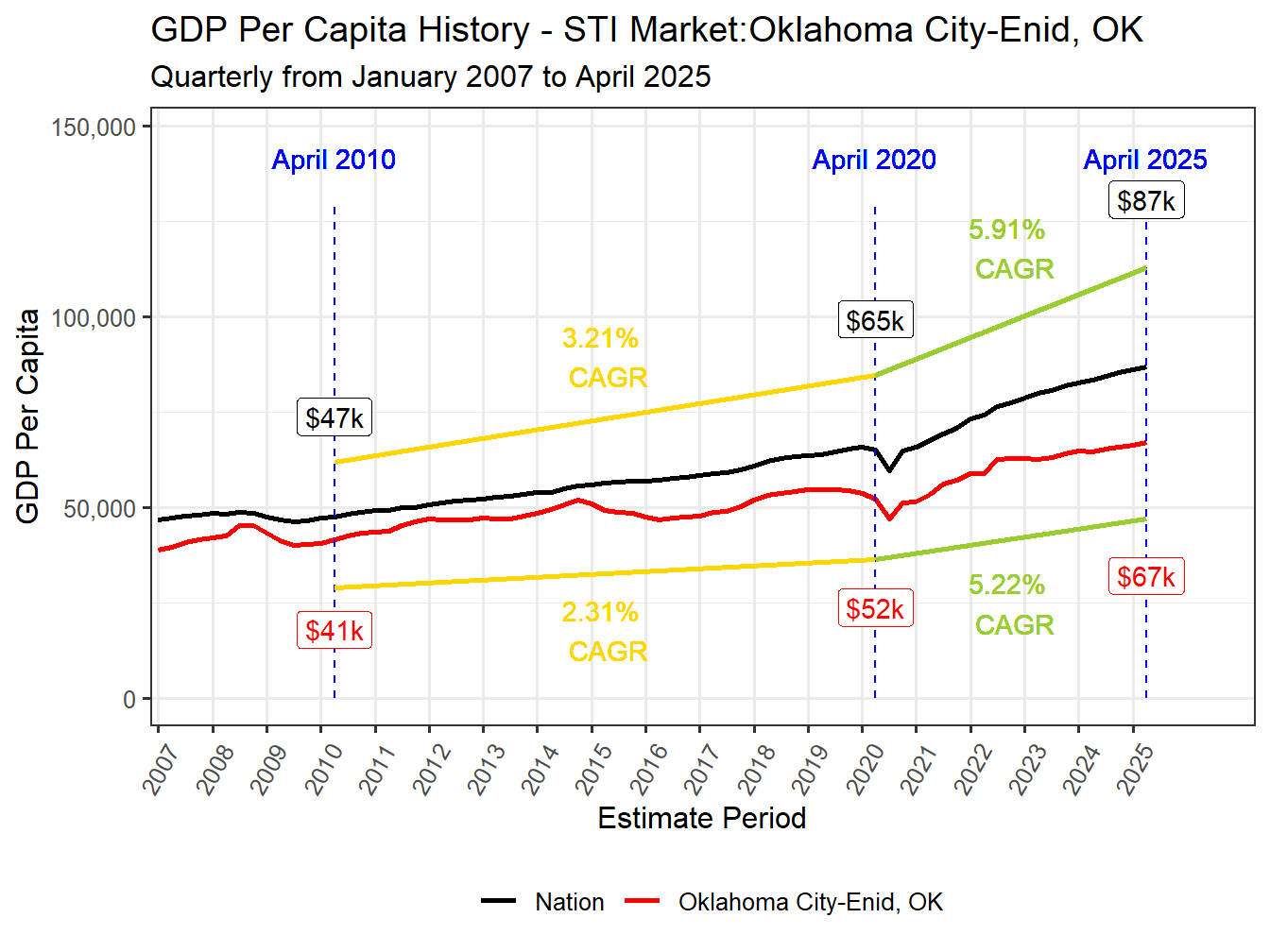 With a GDP of $133.27 billion the Oklahoma City-Enid, OK Market represents 0.45% of the $29.8 Trillion national GDP. In terms of total GDP this market ranks 57th across STI Markets.