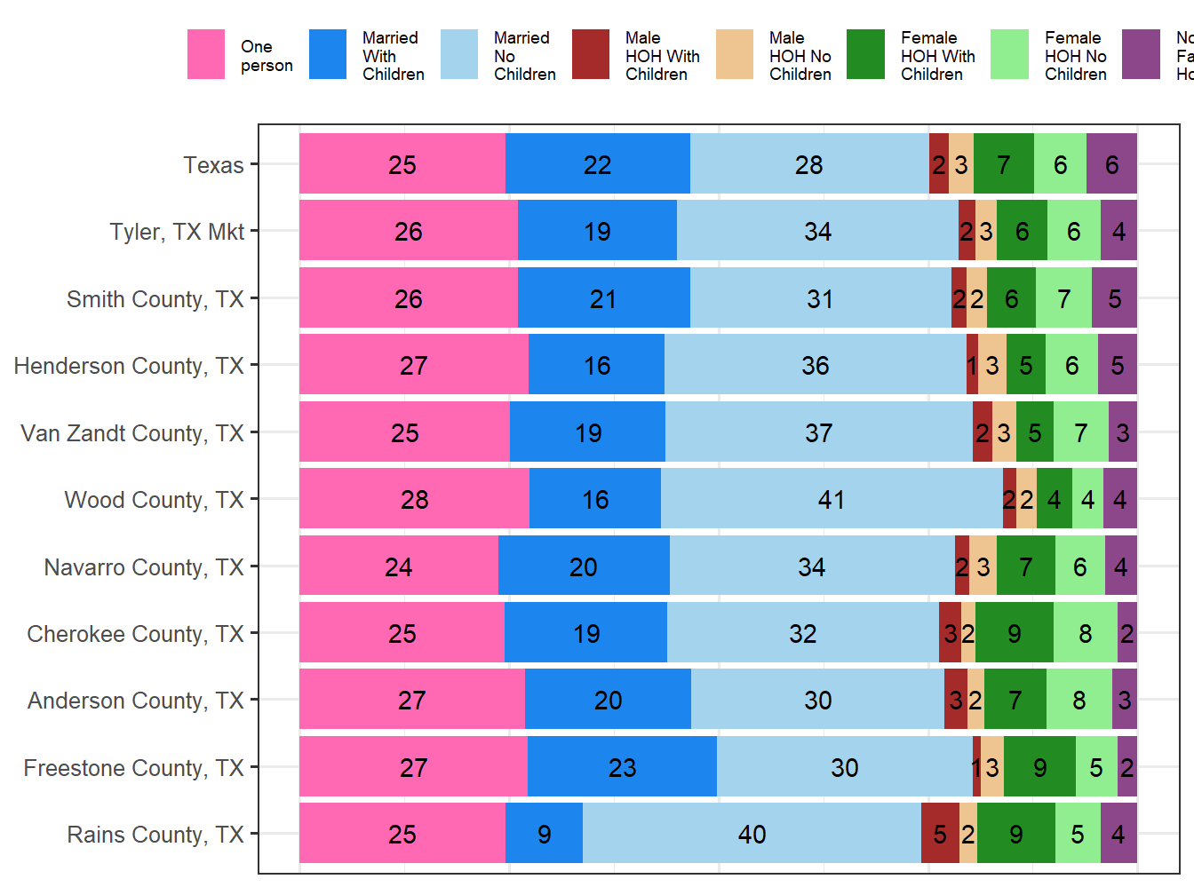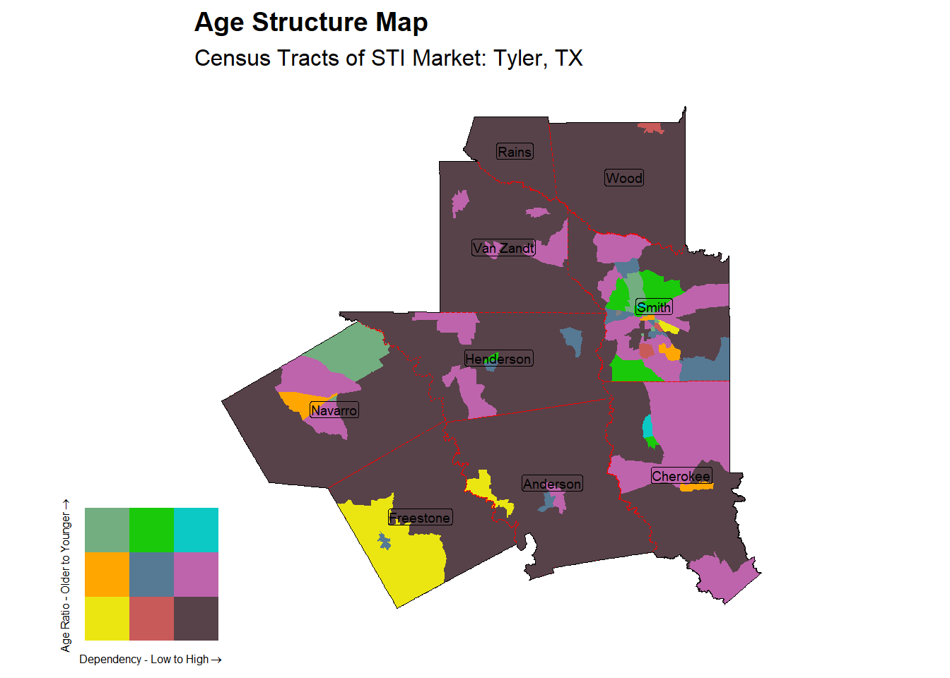 The Tyler, TX market has a dependency ratio of 65.3 which is considered a High level of dependency. The proportion of that dependent population that is under 15 is 44% and subsequently this market could be age wise considered Elderly. These two classifications in mind the Tyler, TX market falls in the Aged Age Structure Classification.