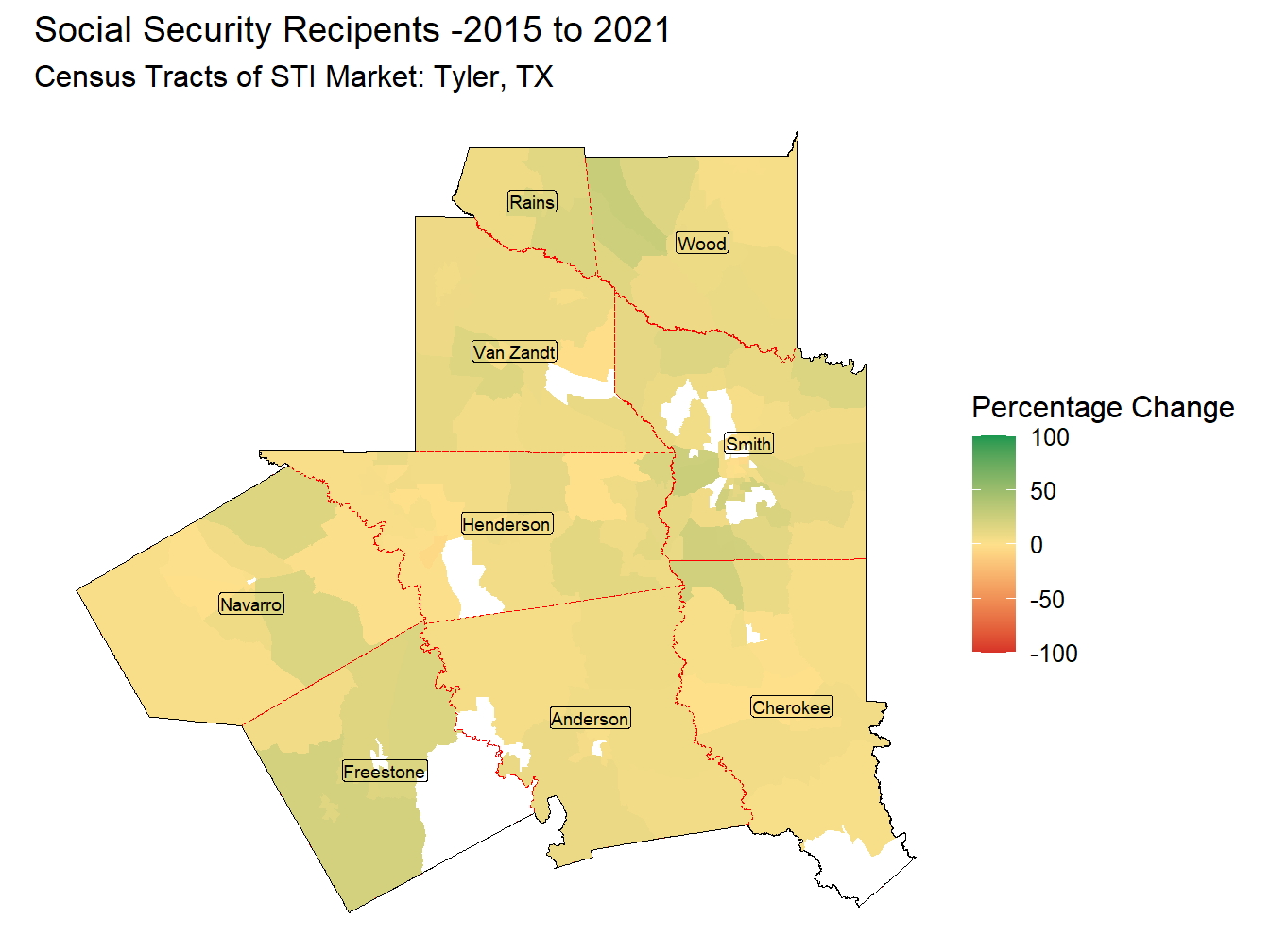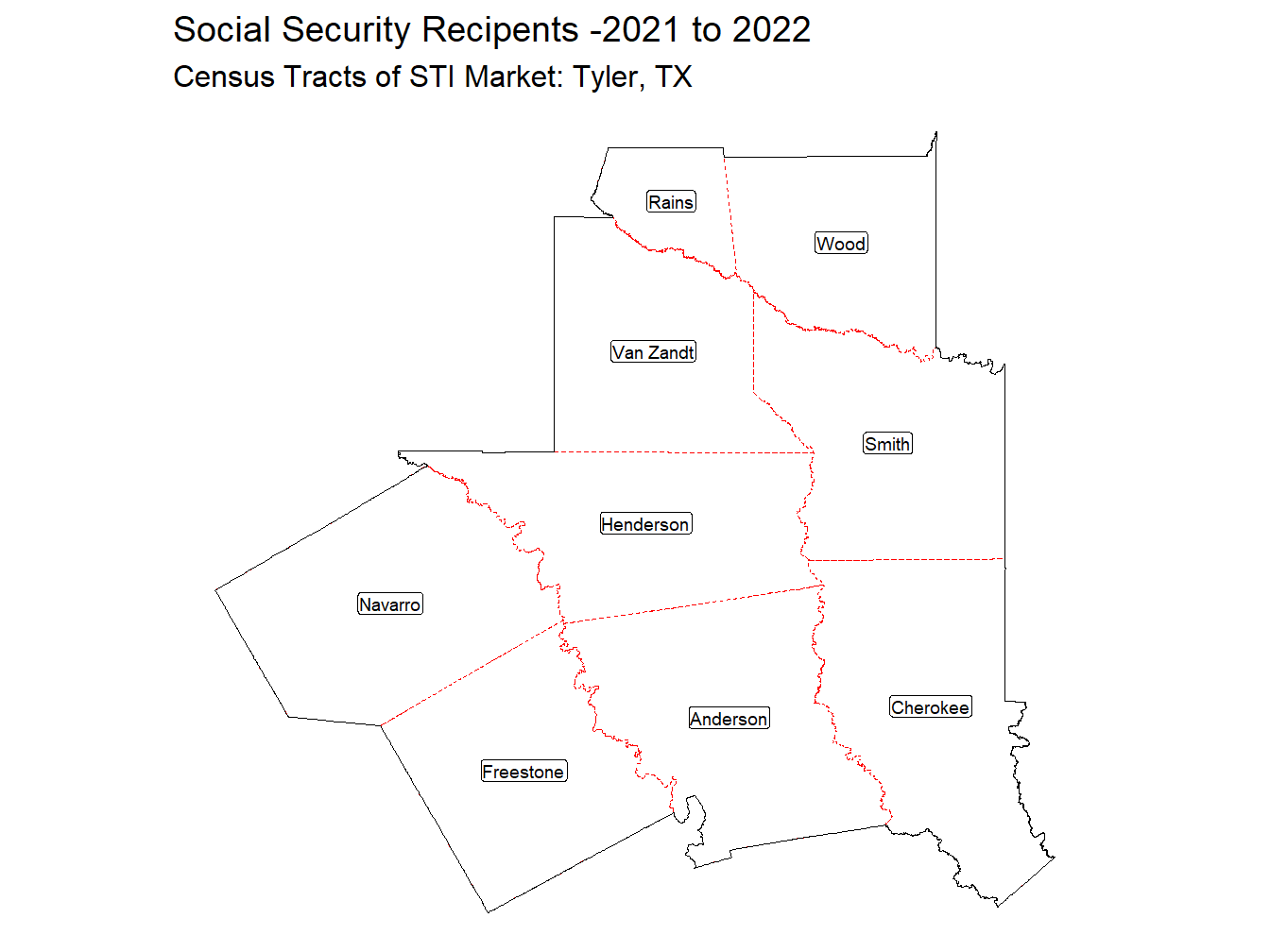 In the Tyler, TX Market, 141,877 out of the Population of 657,500, 21.6%, receive some type of Social Security benefit. This is 1.16 times the National proportion of Social Security Recipients of 18.6%. The market ranks 67th across STI Markets in the proportion of Social Security recipients.