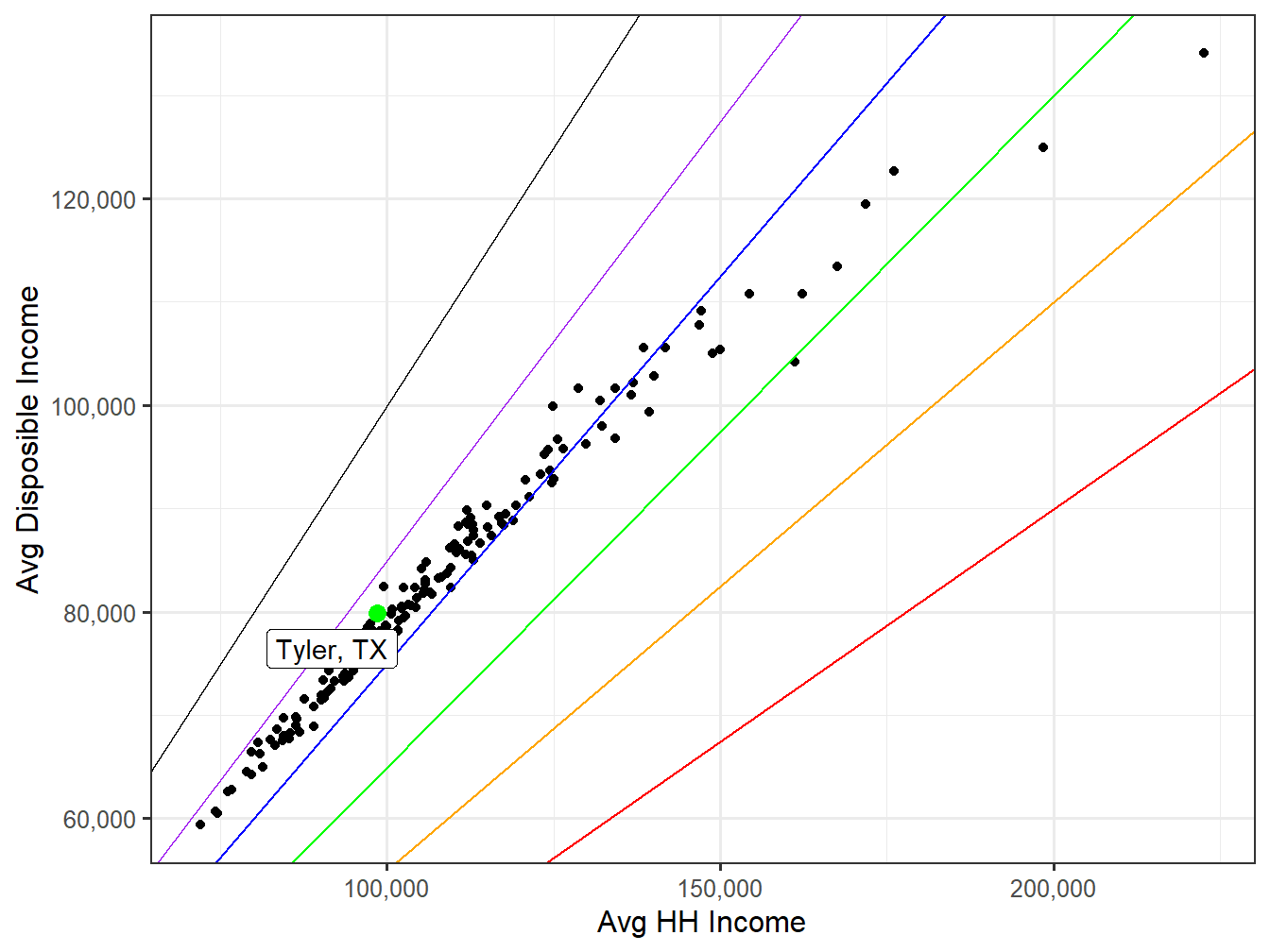 Disposable income is defined here as Household Income after accounting for Federal, State, and Local taxes. The Average Household Disposable Income is $79,858 which ranks 87th across STI Markets.