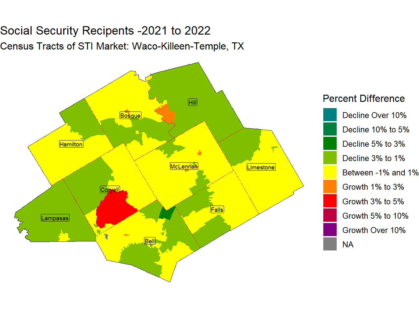 In the Waco-Killeen-Temple, TX Market, 154,516 out of the Population of 891,464, 17.3%, receive some type of Social Security benefit. This is 0.93 times the National proportion of Social Security Recipients of 18.6%. The market ranks 135th across STI Markets in the proportion of Social Security recipients.