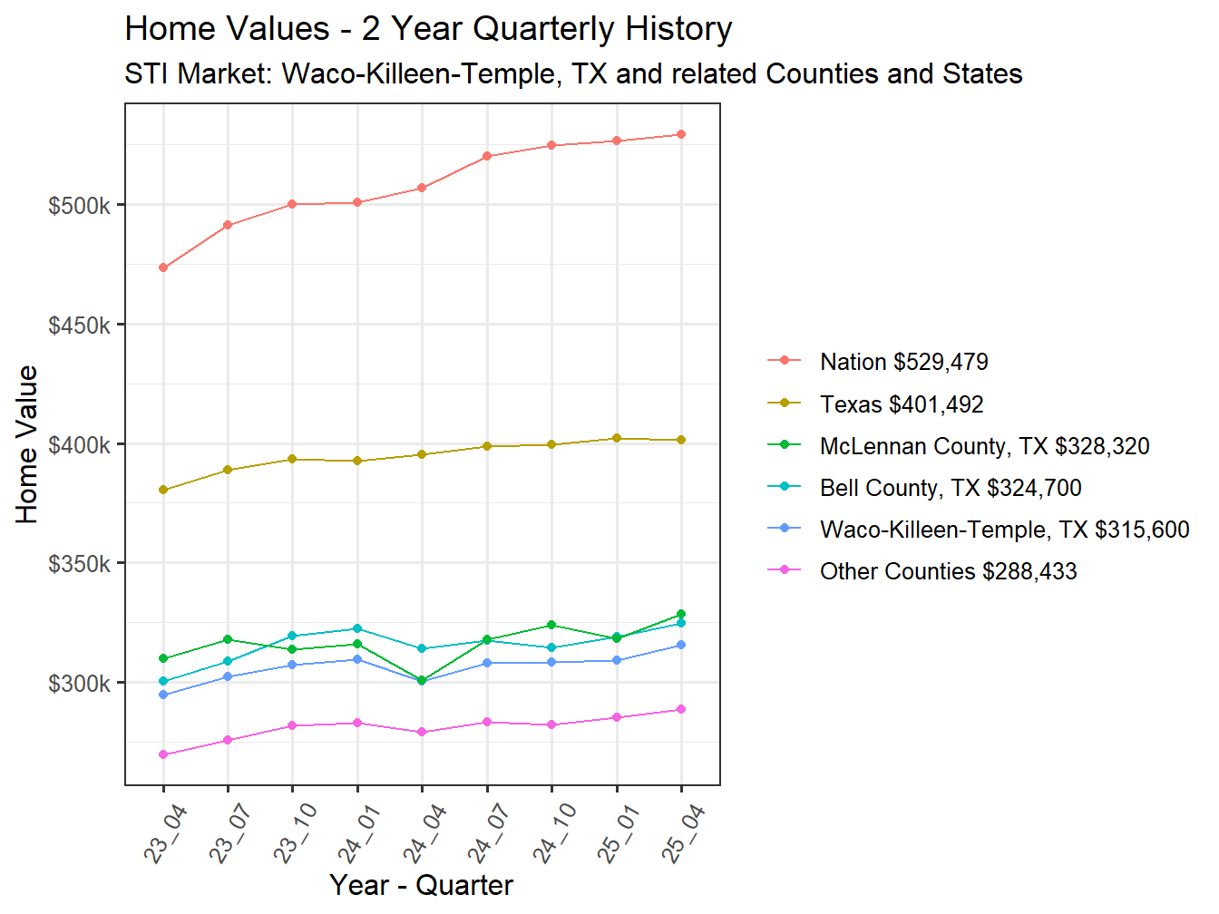 The Average Home Value for owner occupied housing units in the Waco-Killeen-Temple, TX Market is $315,600. This ranks 106th across STI Markets. Over the last 2 years there has been a change of 7.1% in this markets Average Home Value, compared to a national change of 11.8%. This 2 year change in home values ranks 145th across STI Markets.