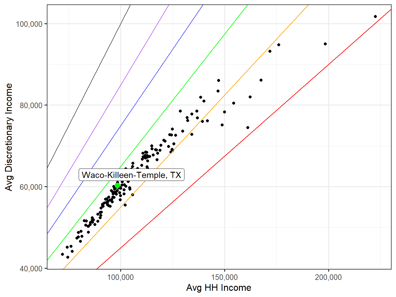 Discretionary income goes a step further. It takes Disposable Income, which already accounts for taxes, and accounts for the typical cost of Food, Housing, and Clothing. The Average Household Discretionary Income is $60,262 which ranks 87th across STI Markets.