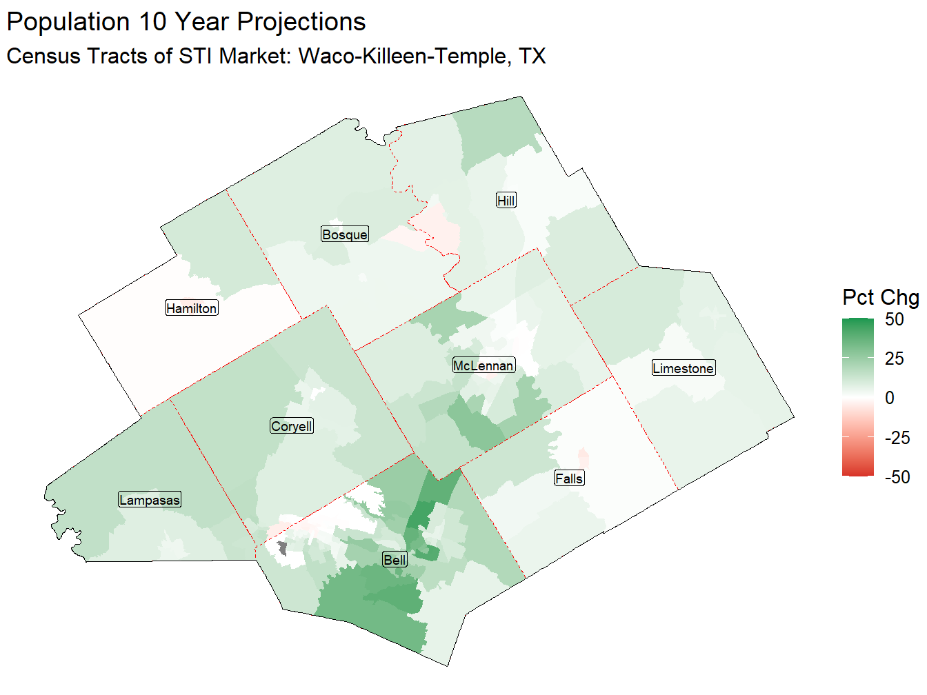 By April 2035 we project the Population of the Waco-Killeen-Temple, TX Market to be 978,957 resulting in a change of 9.8% compared to the current Population. This projected percentage change in Population ranks 34th across STI Markets. The Waco-Killeen-Temple, TX Market currently ranks 103rd in overall population, and will rank 103rd by April 2035.