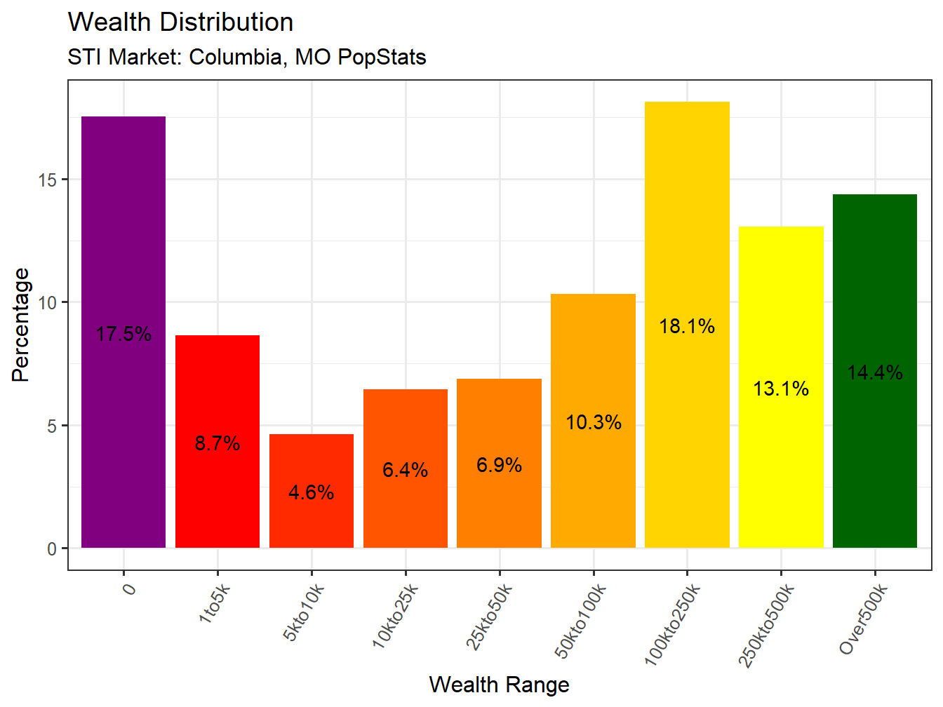 In the Columbia, MO Market, 131,553 out of the Population of 630,622, 20.9%, receive some type of Social Security benefit. This is 1.12 times the National proportion of Social Security Recipients of 18.6%. The market ranks 85th across STI Markets in the proportion of Social Security recipients.
