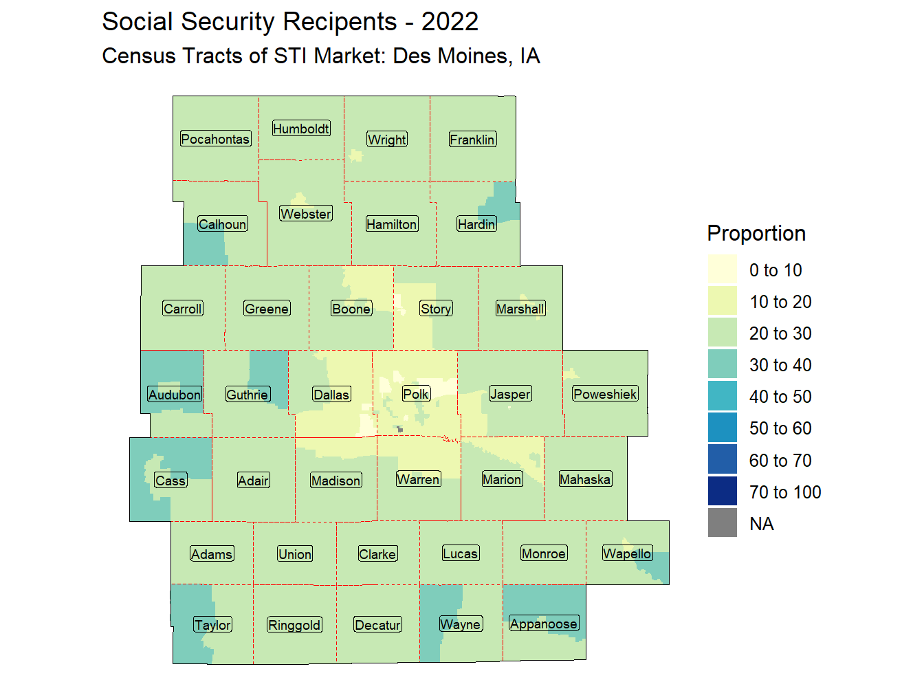 In the Des Moines, IA Market, 242,477 out of the Population of 1,299,484, 18.7%, receive some type of Social Security benefit. This is 1 times the National proportion of Social Security Recipients of 18.6%. The market ranks 121st across STI Markets in the proportion of Social Security recipients.