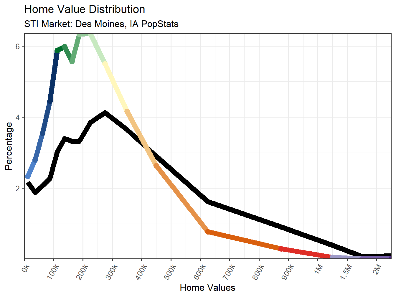 The Average Home Value for owner occupied housing units in the Des Moines, IA Market is $303,546. This ranks 116th across STI Markets. Over the last 2 years there has been a change of 9.7% in this markets Average Home Value, compared to a national change of 11.8%. This 2 year change in home values ranks 113th across STI Markets.