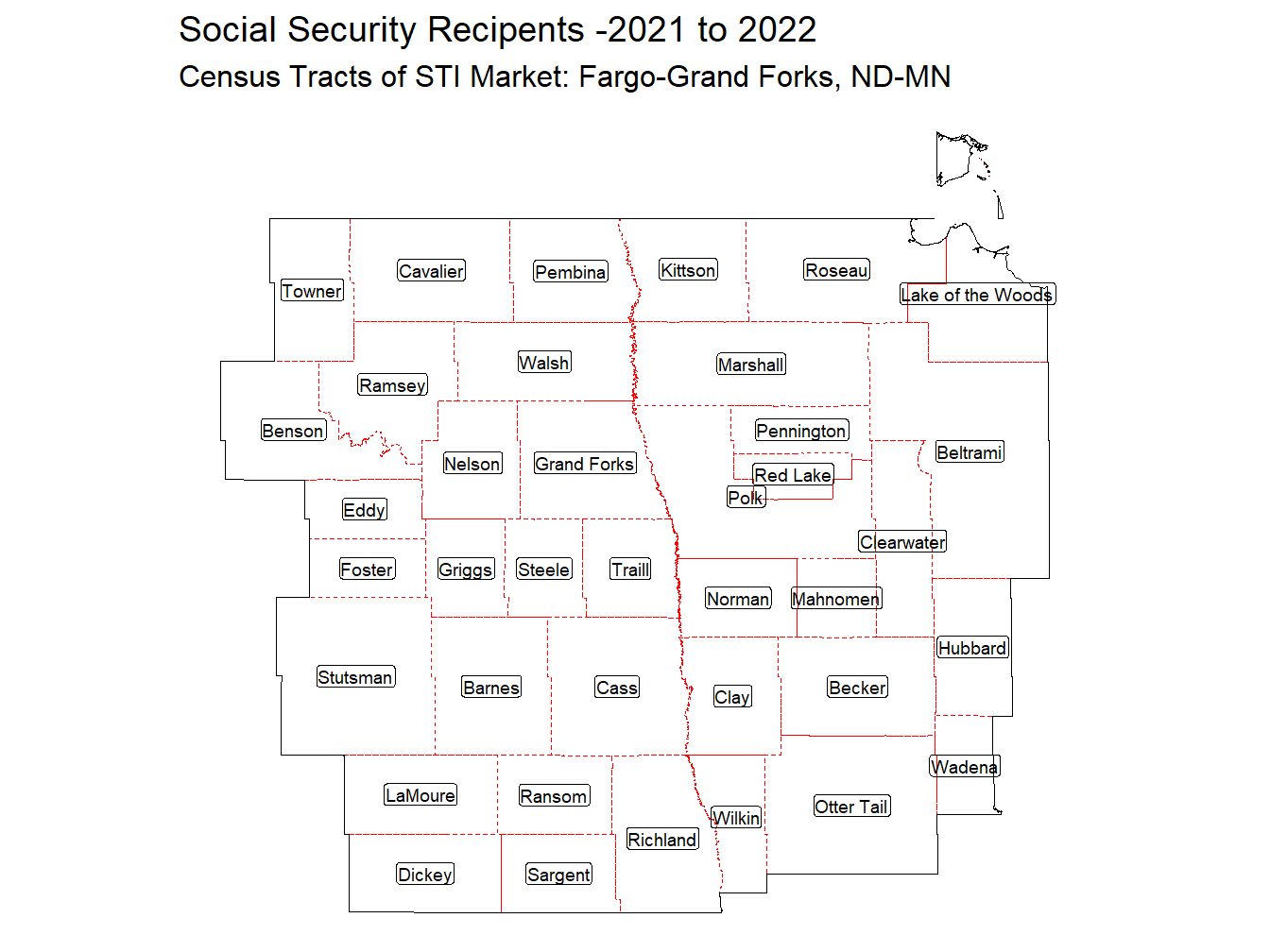 In the Fargo-Grand Forks, ND-MN Market, 156,353 out of the Population of 758,904, 20.6%, receive some type of Social Security benefit. This is 1.11 times the National proportion of Social Security Recipients of 18.6%. The market ranks 92nd across STI Markets in the proportion of Social Security recipients.