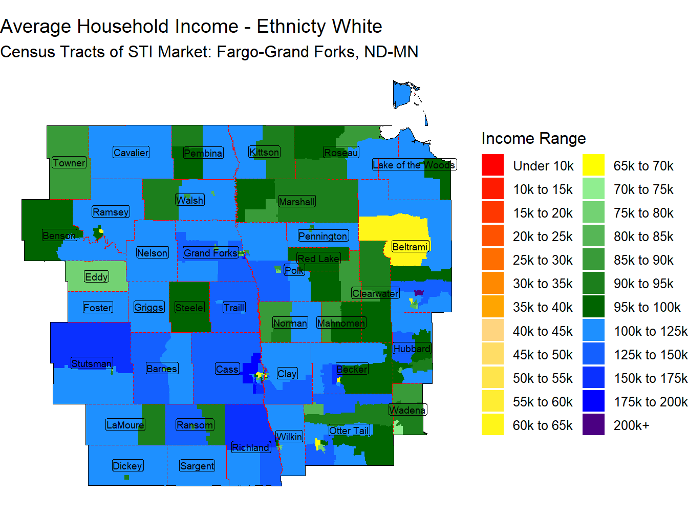 With an Average Household Income for those head of householders Non-Hispanic White of $107,242 the Fargo-Grand Forks, ND-MN market ranks 88th across STI Markets.