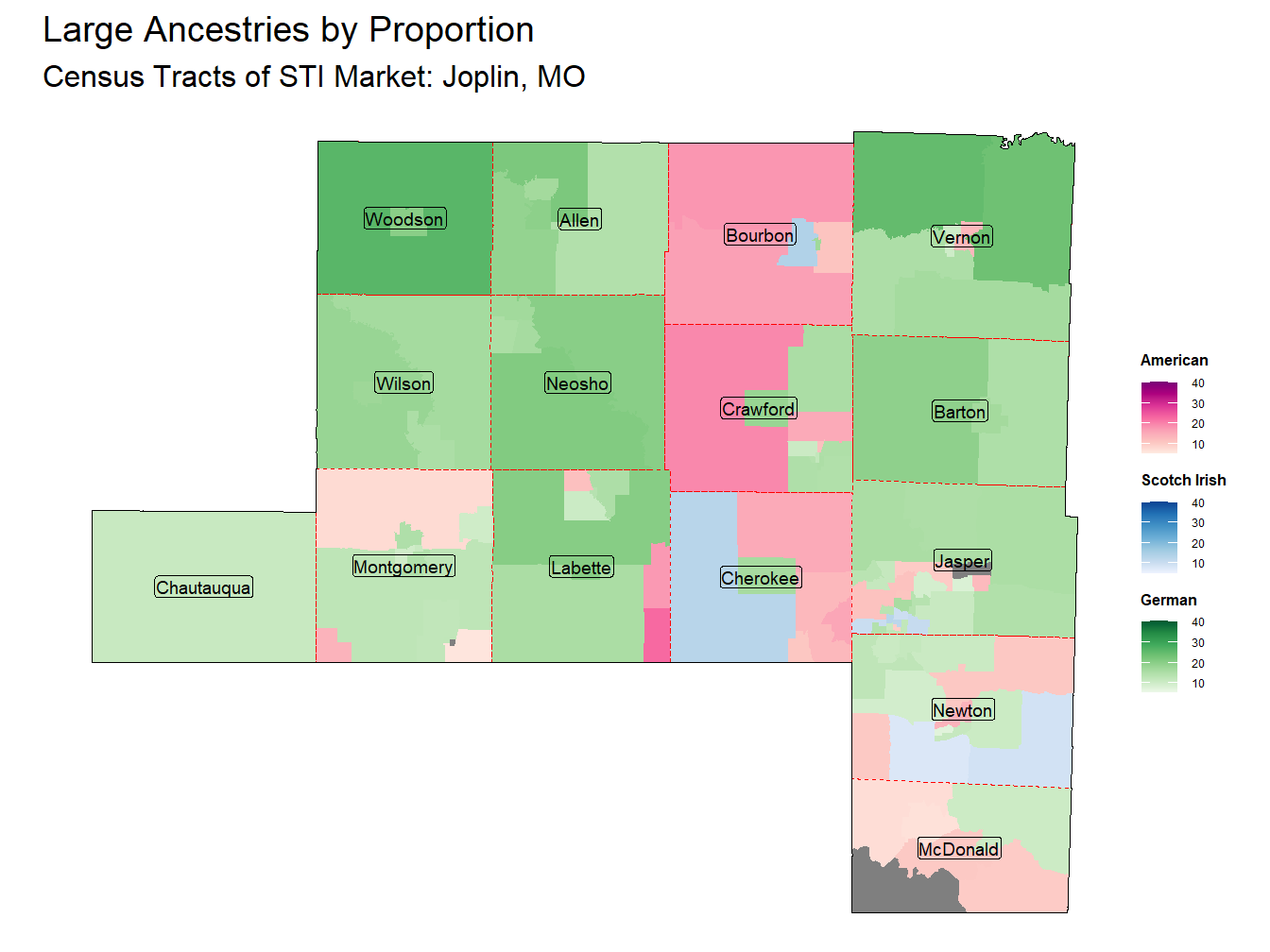 Large ancestries in the Joplin, MO Market include German, American, and Scotch Irish . These ancestries make up 11.8%, 9.1%, and 8.4% of the total population, respectively. When comparing to national proportions, the American ancestry is the most notable with a location quotient of 2.28 the proportion of this ancestry ranks 21st across STI Markets.