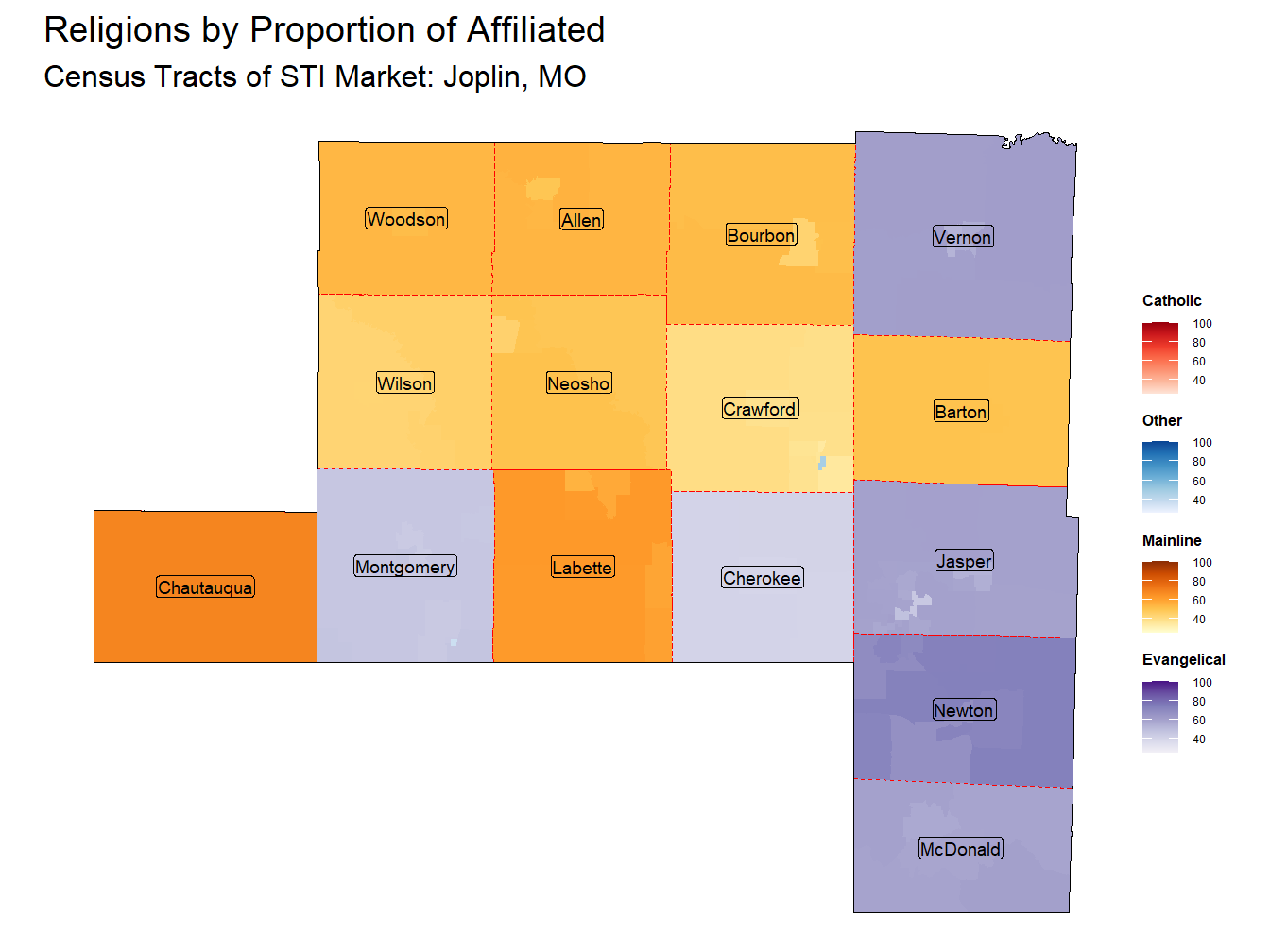 The 3 largest main religions in the Joplin, MO Market are Evangelical, Mainline, and Catholic . These religions make up 49.2%, 33.9%, and 12.7% of the affiliated population, respectively. When comparing to national proportions, the Evangelical religion is the most notable with a location quotient of 1.96 the proportion of this religion ranks 37th across STI Markets.