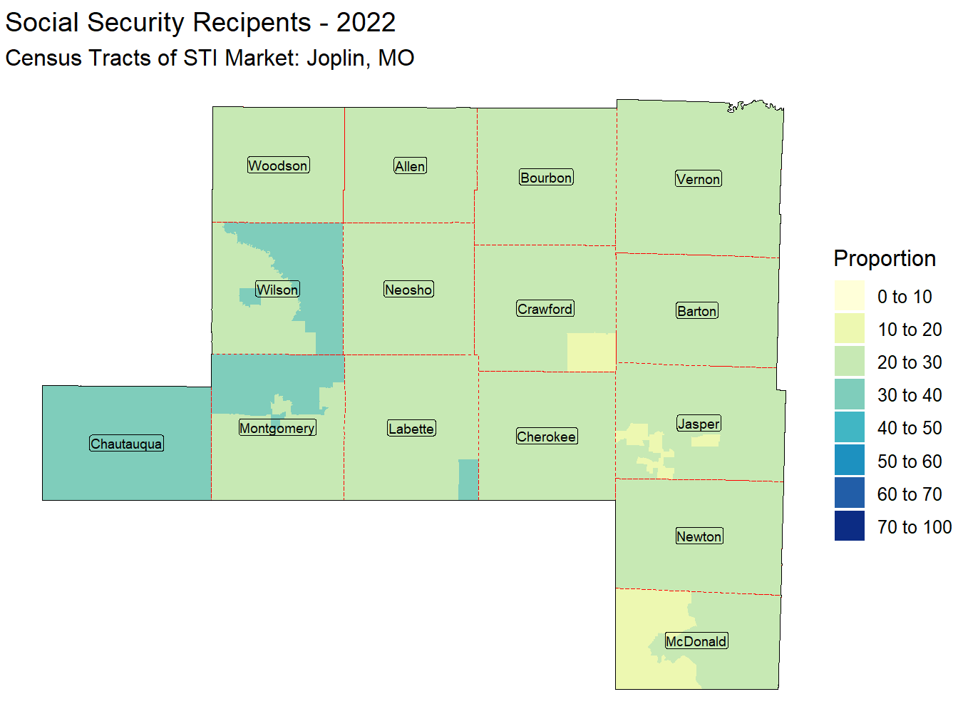 In the Joplin, MO Market, 93,566 out of the Population of 410,572, 22.8%, receive some type of Social Security benefit. This is 1.22 times the National proportion of Social Security Recipients of 18.6%. The market ranks 45th across STI Markets in the proportion of Social Security recipients.