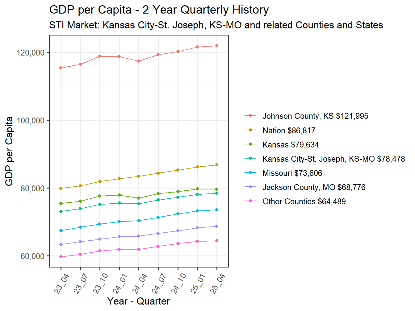 With a GDP of $223.80 billion the Kansas City-St. Joseph, KS-MO Market represents 0.75% of the $29.8 Trillion national GDP. In terms of total GDP this market ranks 37th across STI Markets.