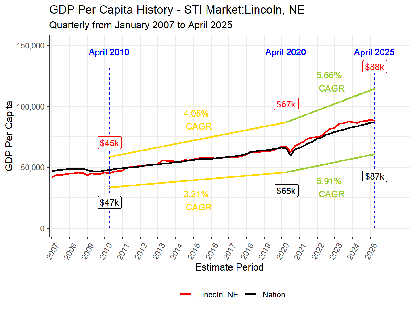 With a GDP of $68.50 billion the Lincoln, NE Market represents 0.23% of the $29.8 Trillion national GDP. In terms of total GDP this market ranks 101st across STI Markets.