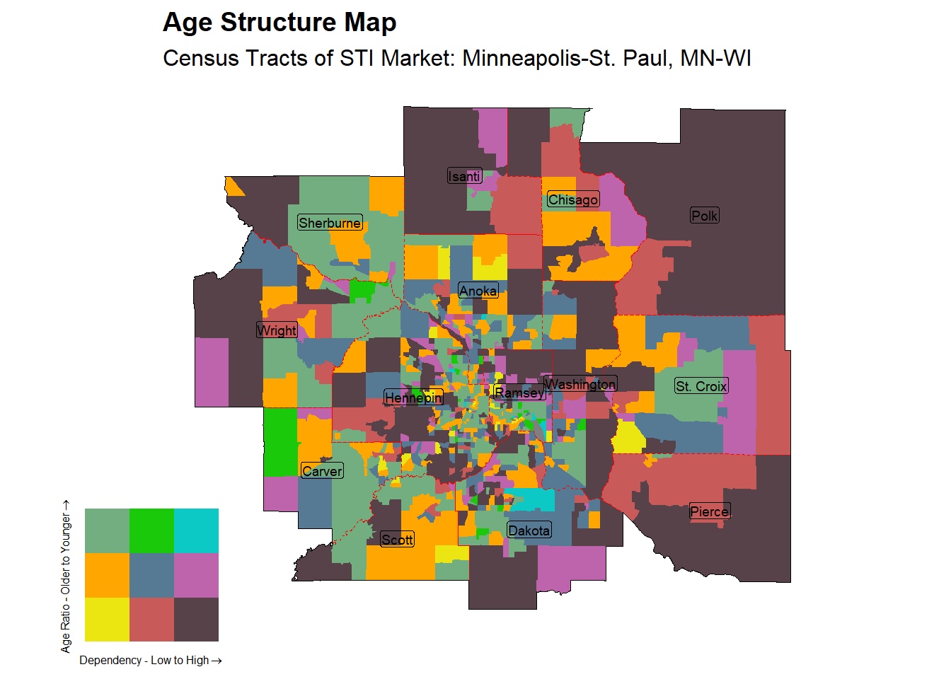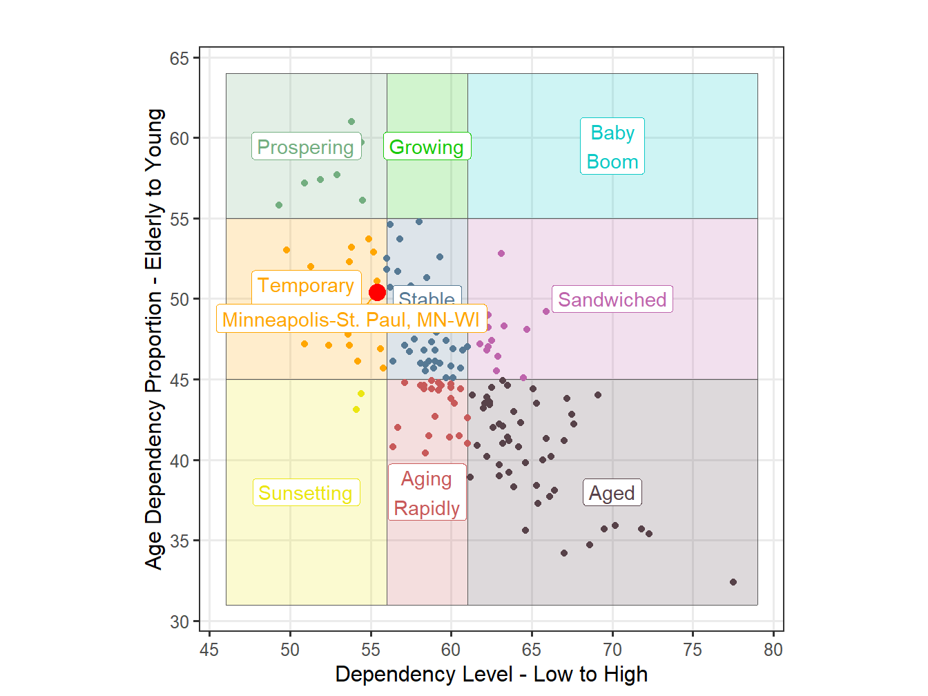 This report looks at the Age distribution of the Minneapolis-St. Paul, MN-WI and quantifies the structure in to 9 possible categories. These are based on 2 scales, Dependency and Age Proportion Ratio of the Dependency. Dependency here is the ratio of dependent population, include older dependents over 65 and younger dependents under 15 compared to the 15 to 65 working age population. This measure is often used a way of quantify the amount of strain that the working age population might have in supporting those not working and is sometimes further refined to focus on only those currently working. In this case however we focus only on the age structure. The percentage that the young make up of the dependent population yields the Dependent Age Proportion, with a higher value indicating a younger population.