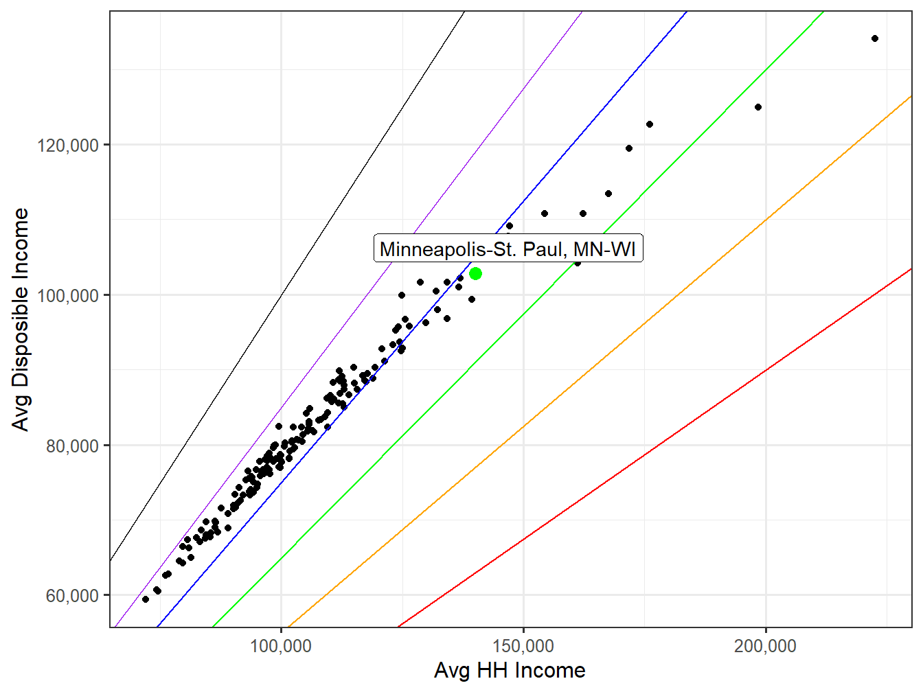 Below the multi-colored line represents the same data for household income in the Minneapolis-St. Paul, MN-WI market, but more equally lays out the distribution of population versus the income level, correcting for differences in size of income ranges. You will also notice that after 200k the income ranges are scaled down so the focus is more centered on the more numerous Households making under 200k. The black line represents the National Income Distribution for comparison.