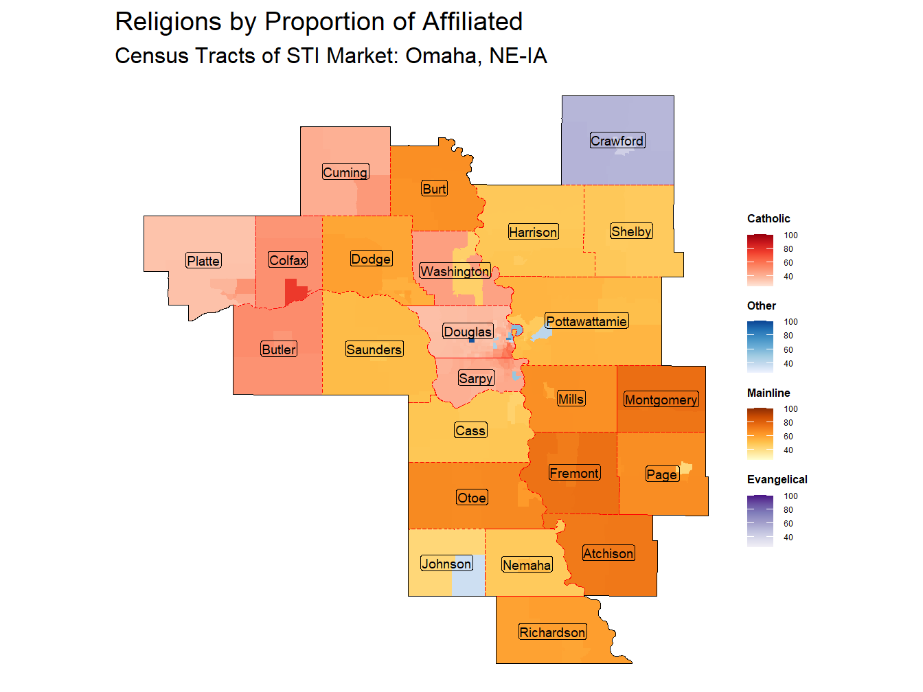 42% of the population in the Omaha, NE-IA Market is of unknown religious affiliation. This category is generally made up of those that are not religiously affiliated, though a small fraction may represent dharmic religions. This level of unknown religious affiliation ranks 98th across STI Markets. The following looks at the remaining 58% of the population that are affiliated.
