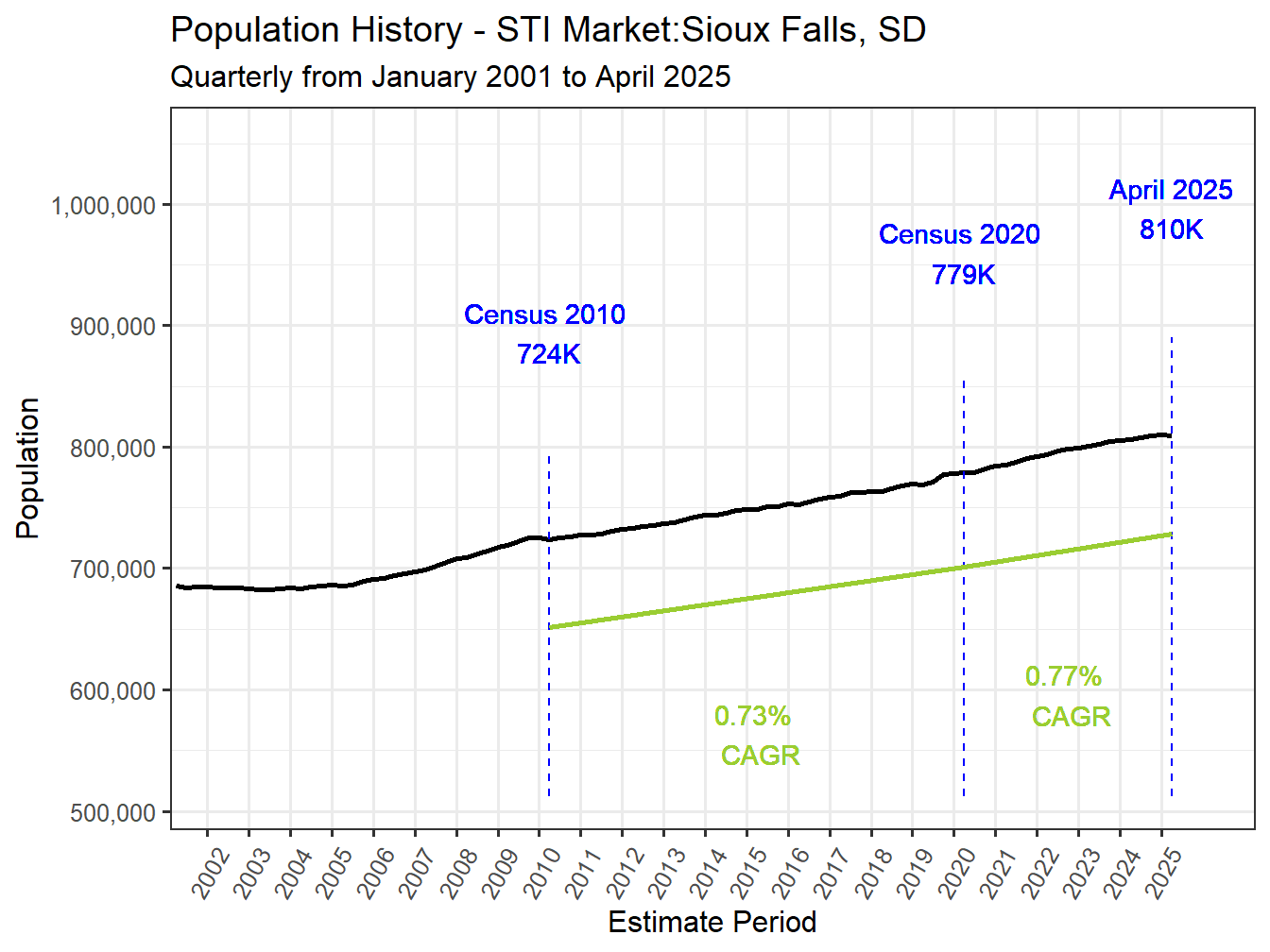 With a 2 Year Compound Annual Growth Rate (CAGR) of 0.55% the Sioux Falls, SD Market is growing. It ranks 65th in 2 year population change across all STI Markets.