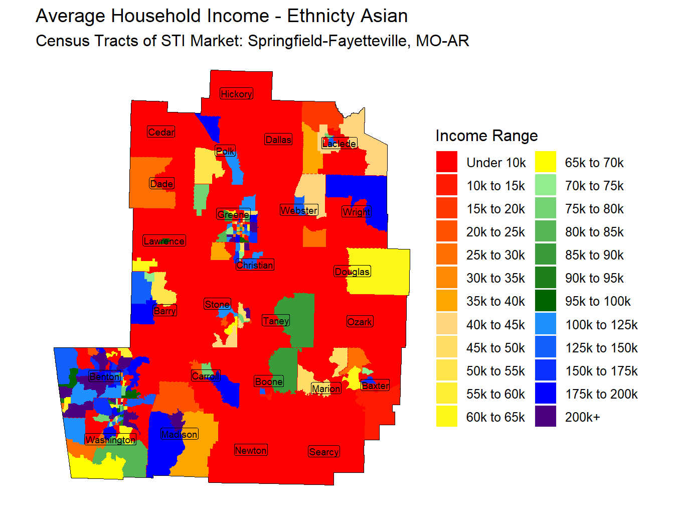 With an Average Household Income for those head of householders identifying as Non-Hispanic Asian of $140,532 the Springfield-Fayetteville, MO-AR market ranks 39th across STI Markets.