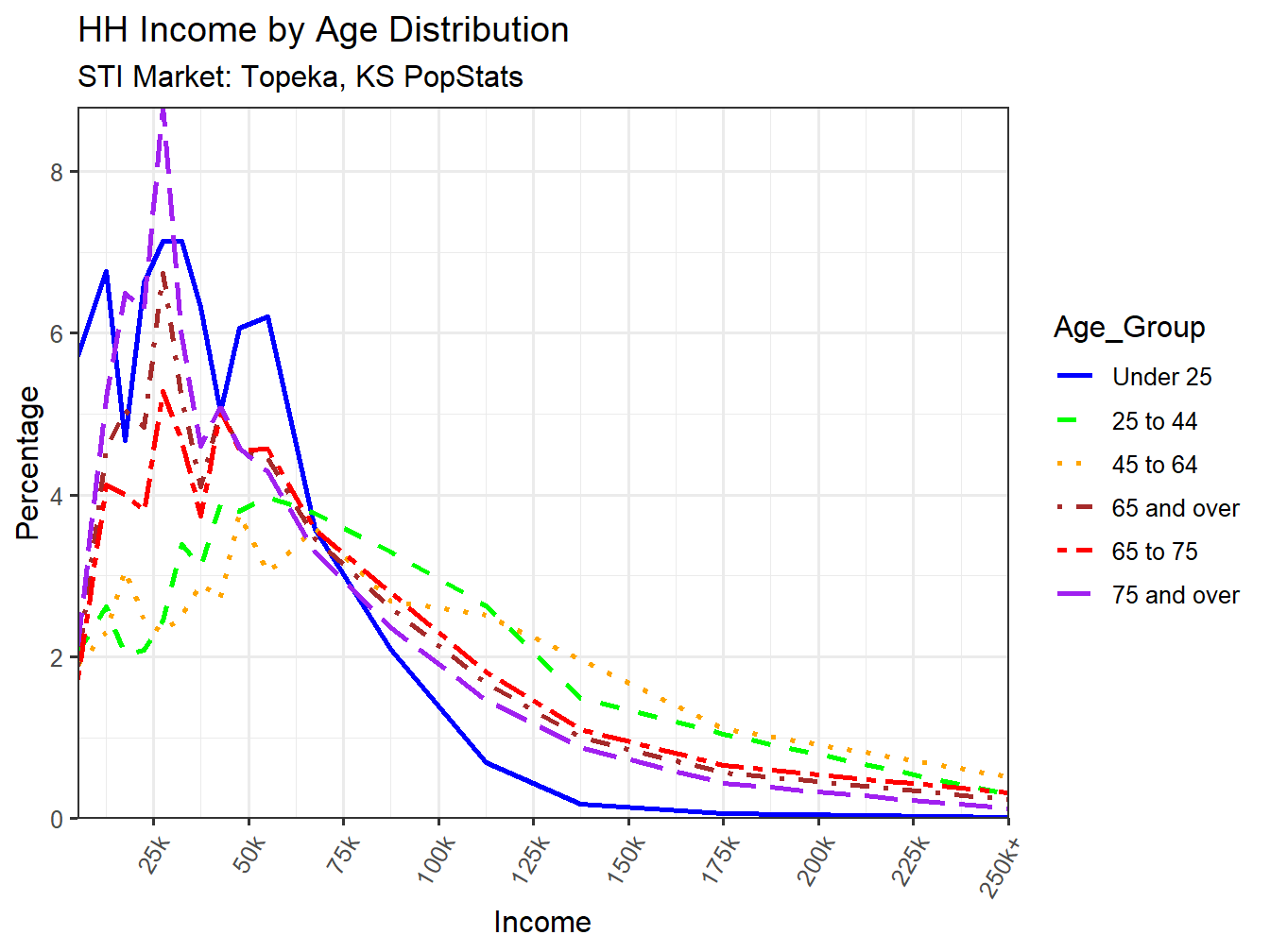 Below the multi-colored line represents the same data for household income in the Topeka, KS market, but more equally lays out the distribution of population versus the income level, correcting for differences in size of income ranges. You will also notice that after 200k the income ranges are scaled down so the focus is more centered on the more numerous Households making under 200k. The black line represents the National Income Distribution for comparison.
