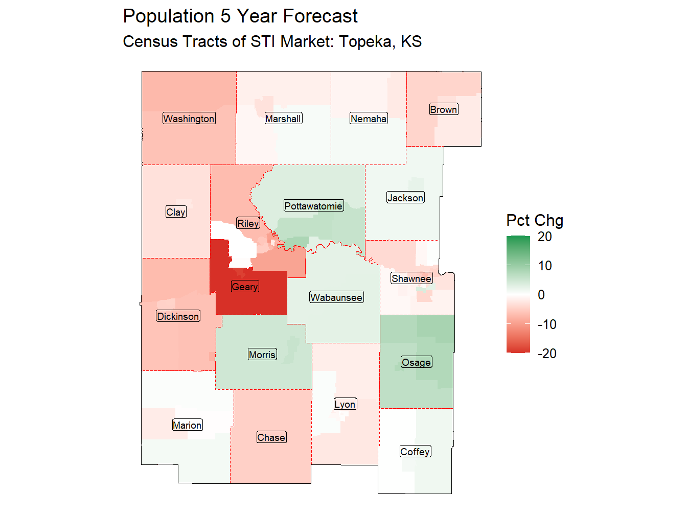 By April 2035 we project the Population of the Topeka, KS Market to be 444,521 resulting in a change of -5.8% compared to the current Population. This projected percentage change in Population ranks 166th across STI Markets. The Topeka, KS Market currently ranks 150th in overall population, and will rank 152nd by April 2035.