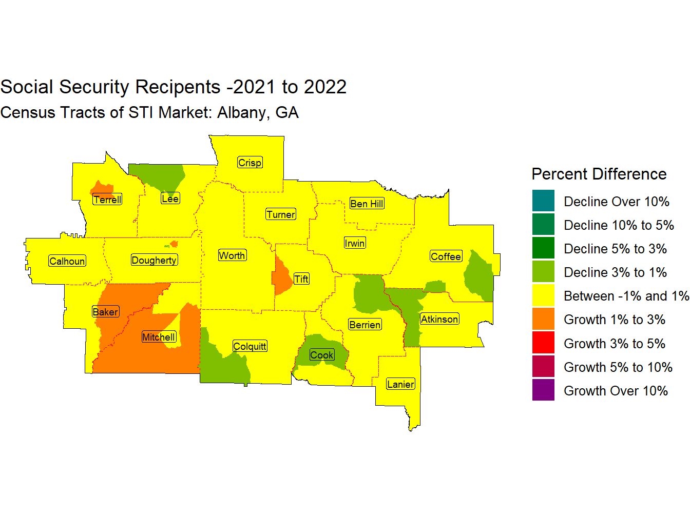 In the Albany, GA Market, 89,205 out of the Population of 419,764, 21.3%, receive some type of Social Security benefit. This is 1.14 times the National proportion of Social Security Recipients of 18.6%. The market ranks 73rd across STI Markets in the proportion of Social Security recipients.