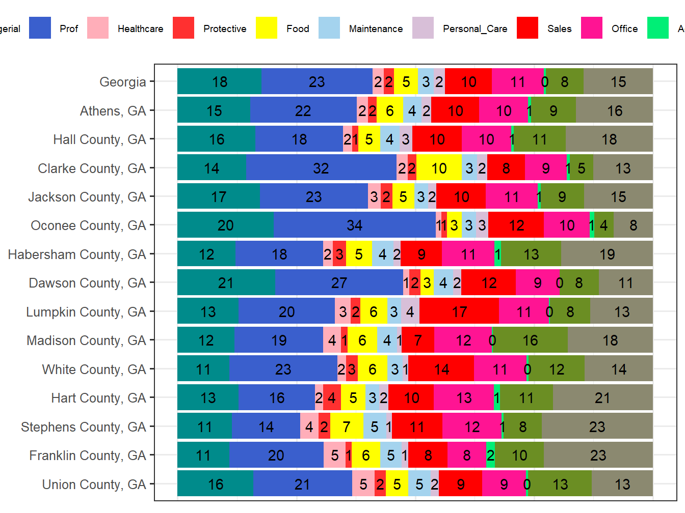 The proportion of employment in the Prod_Transport occupation in the Athens, GA Market is notable. This occupation comprises 16.1% of the market’s employment, yielding a location quotient of 1.25 time the national average. Subsequently the Athens, GA Market ranks 52nd in the proportion of Prod_Transport employment across STI Markets.
