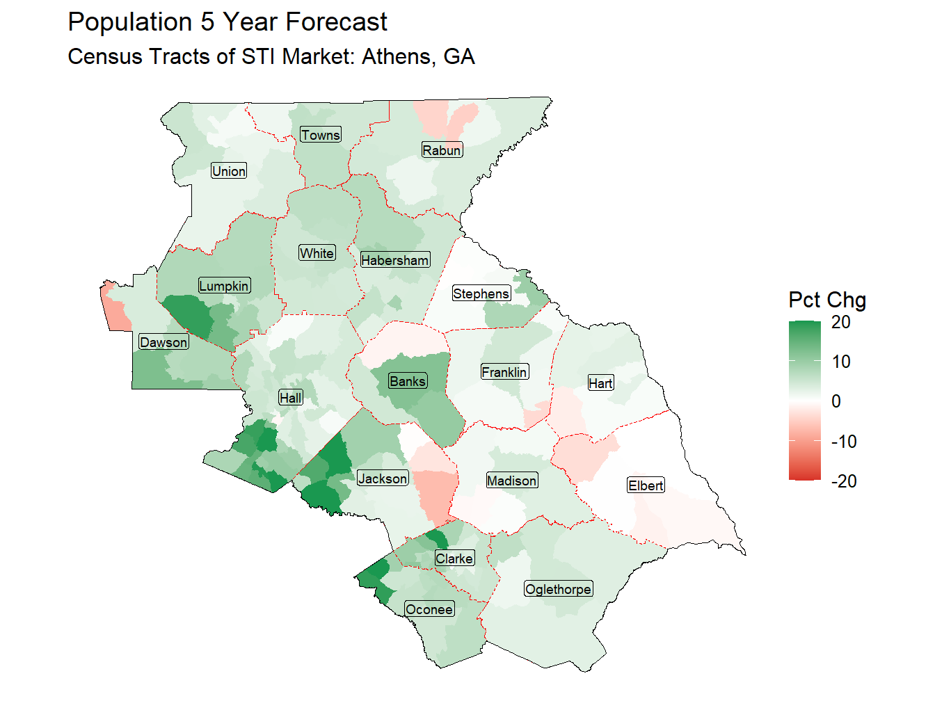 While the summation of mid range 5 year forecasts foresee a change in Population of 6.2% for Athens, GA Market. The forecast high ranges of these forecasts leaves open the possibility for a Population change as high as 18.8% at 1,045,383. Similarly a population change as low as -0.2% at 878,246 is not without possibility.