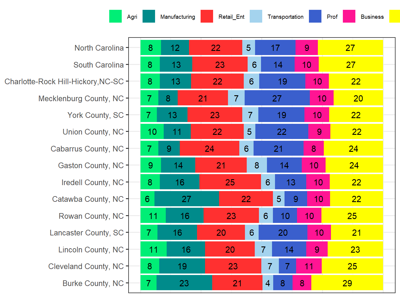 The proportion of employment in the Prod_Transport occupation in the Charlotte-Rock Hill-Hickory,NC-SC Market is notable. This occupation comprises 15.1% of the market’s employment, yielding a location quotient of 1.17 time the national average. Subsequently the Charlotte-Rock Hill-Hickory,NC-SC Market ranks 70th in the proportion of Prod_Transport employment across STI Markets.
