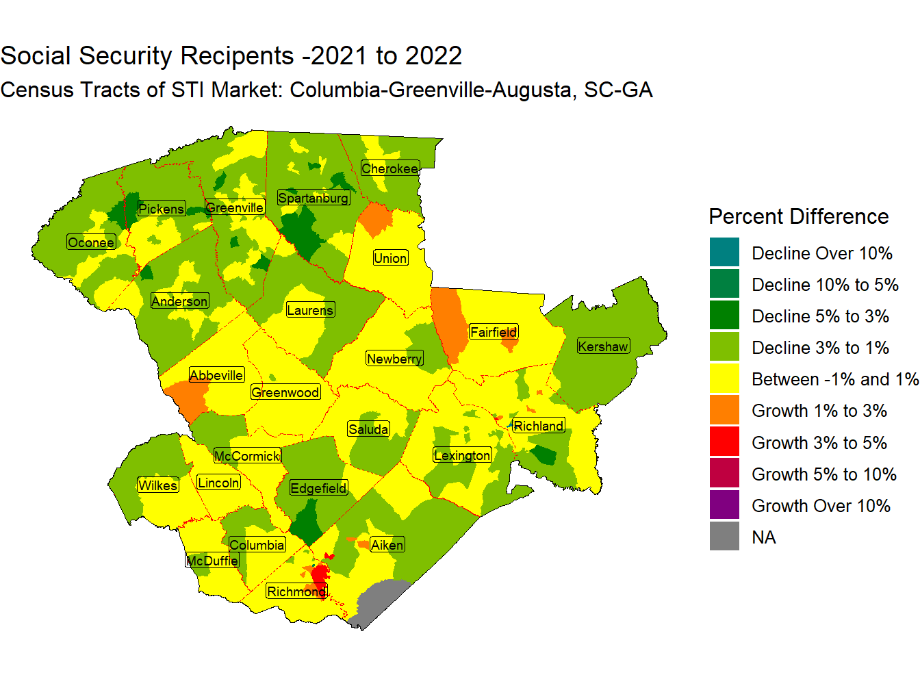 In the Columbia-Greenville-Augusta, SC-GA Market, 667,810 out of the Population of 3,197,395, 20.9%, receive some type of Social Security benefit. This is 1.12 times the National proportion of Social Security Recipients of 18.6%. The market ranks 82nd across STI Markets in the proportion of Social Security recipients.