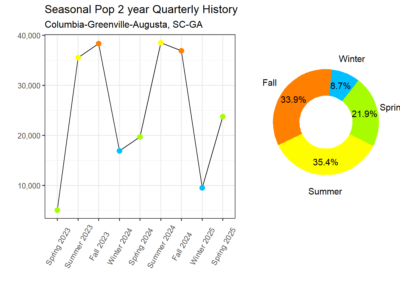 Seasonal visitation peaks in the Summer with a Seasonal Population of 38,527. The off season is the Winter with a Seasonal Population of 9,501. Given the difference between the primary and off seasons the Columbia-Greenville-Augusta, SC-GA Market is classified as having a High level of seasonal variation, ranking 125th across STI Markets.