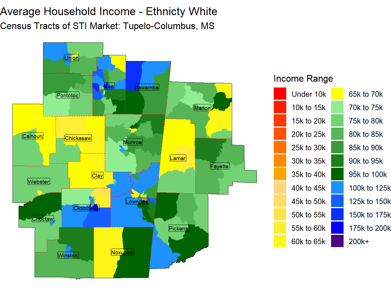 With an Average Household Income for those head of householders Non-Hispanic White of $89,267 the Tupelo-Columbus, MS market ranks 153rd across STI Markets.