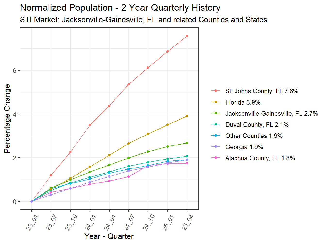 With a 2 Year Compound Annual Growth Rate (CAGR) of 1.33% the Jacksonville-Gainesville, FL Market is growing. It ranks 23rd in 2 year population change across all STI Markets.