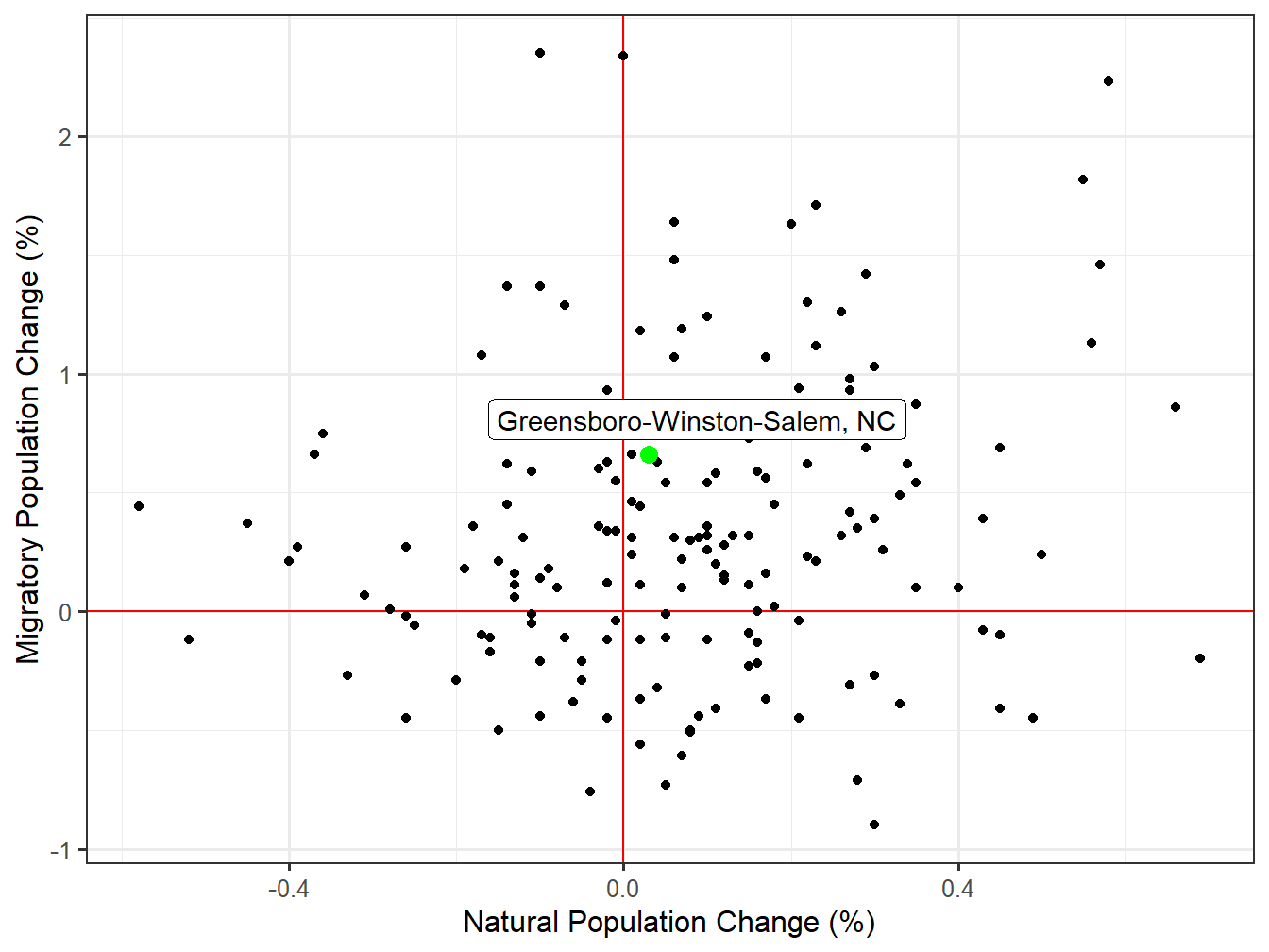 With a 2 Year Compound Annual Growth Rate (CAGR) of 0.83% the Greensboro-Winston-Salem, NC Market is growing. It ranks 45th in 2 year population change across all STI Markets.