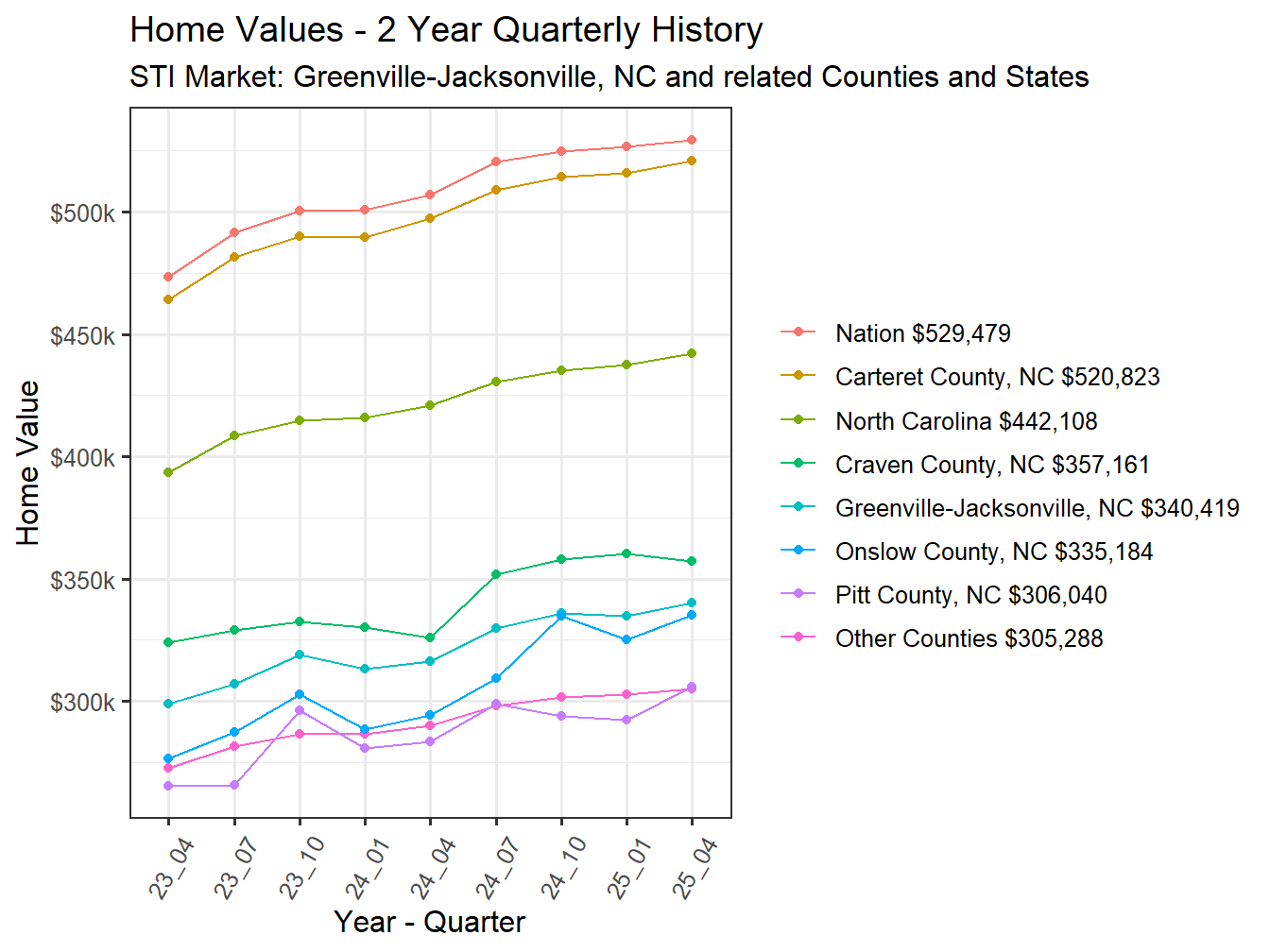The Average Home Value for owner occupied housing units in the Greenville-Jacksonville, NC Market is $340,419. This ranks 92nd across STI Markets. Over the last 2 years there has been a change of 13.8% in this markets Average Home Value, compared to a national change of 11.8%. This 2 year change in home values ranks 61st across STI Markets.