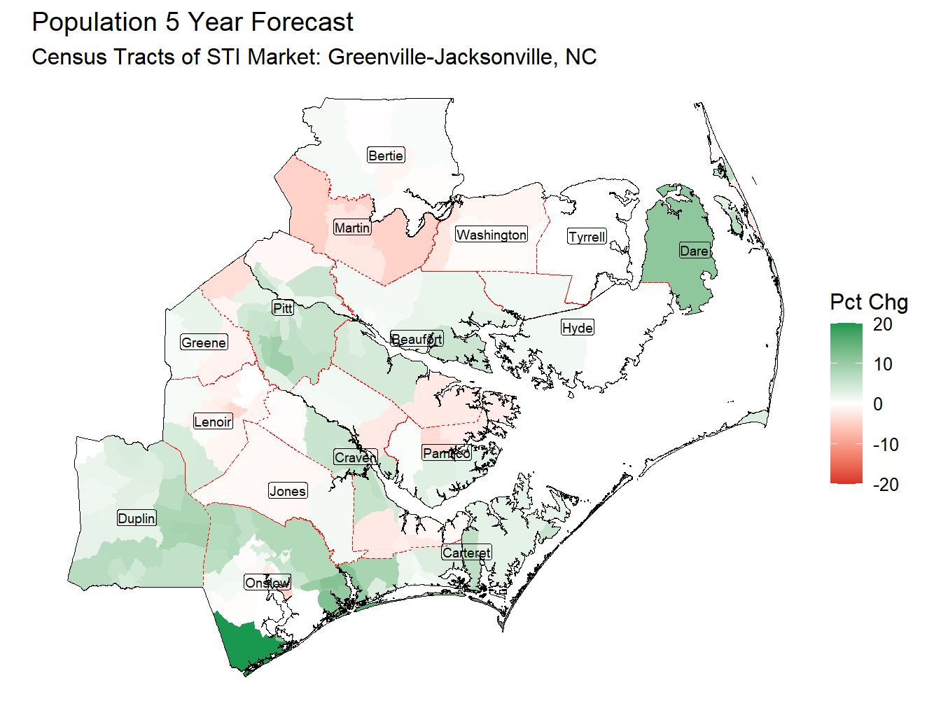 By April 2035 we project the Population of the Greenville-Jacksonville, NC Market to be 932,289 resulting in a change of 7.9% compared to the current Population. This projected percentage change in Population ranks 56th across STI Markets. The Greenville-Jacksonville, NC Market currently ranks 106th in overall population, and will rank 106th by April 2035.