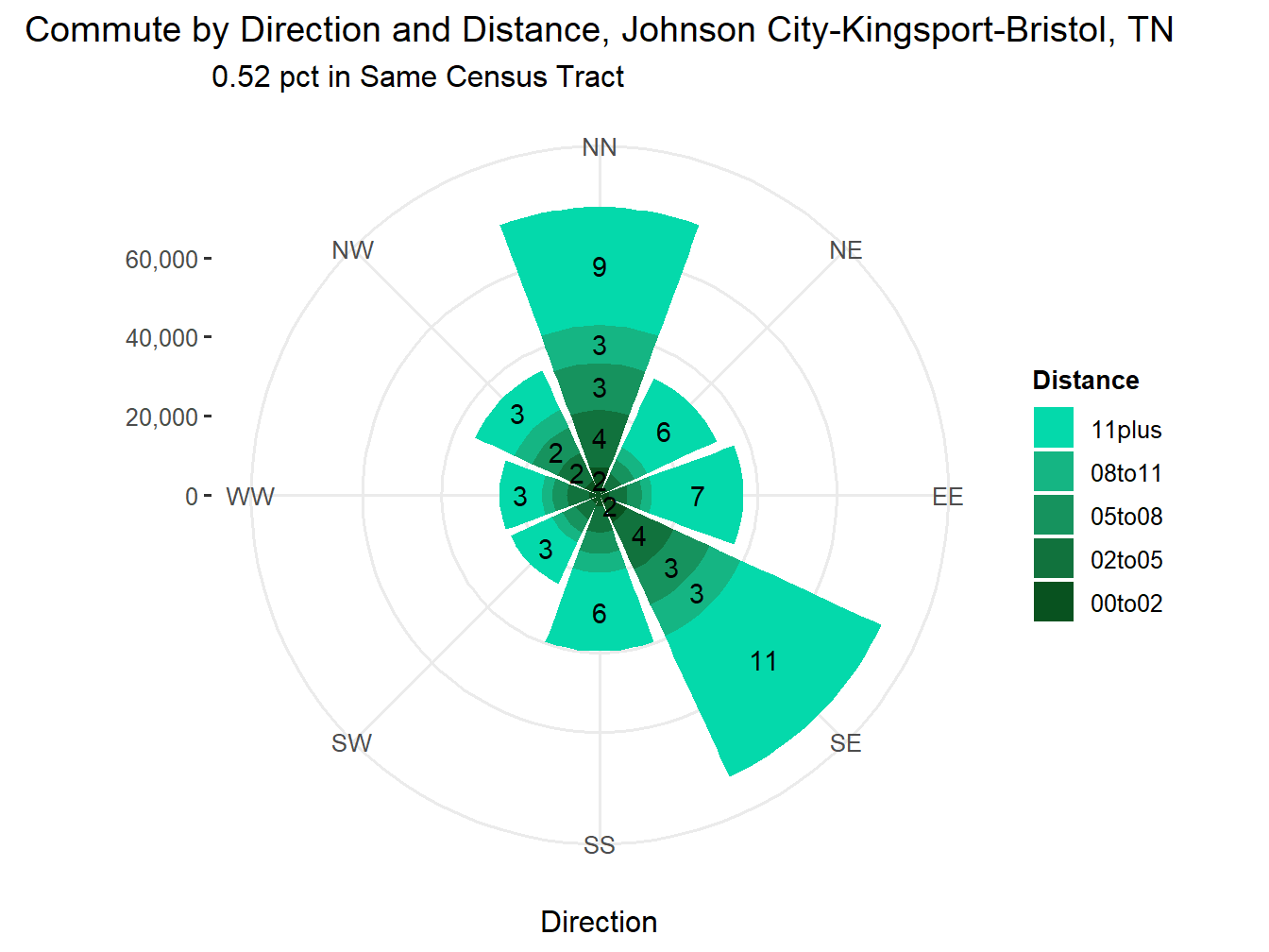 The following shows the commute to work patterns for the Johnson City-Kingsport-Bristol, TN Market. The average direction is found via a circular mean function. The concentration is the proportion of overall travel headed in that direction and those adjacent to that direction. Length of arrow is scaled by the distance traveled. Together this allows for a general view of how traffic flows around the market each morning.