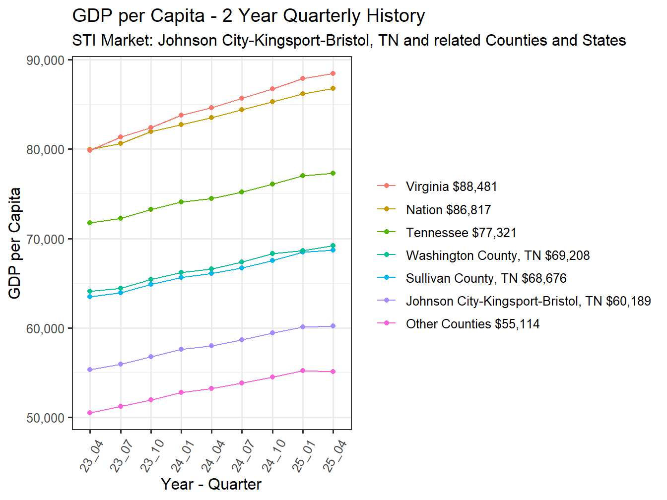 With a GDP of $49.54 billion the Johnson City-Kingsport-Bristol, TN Market represents 0.17% of the $29.8 Trillion national GDP. In terms of total GDP this market ranks 124th across STI Markets.