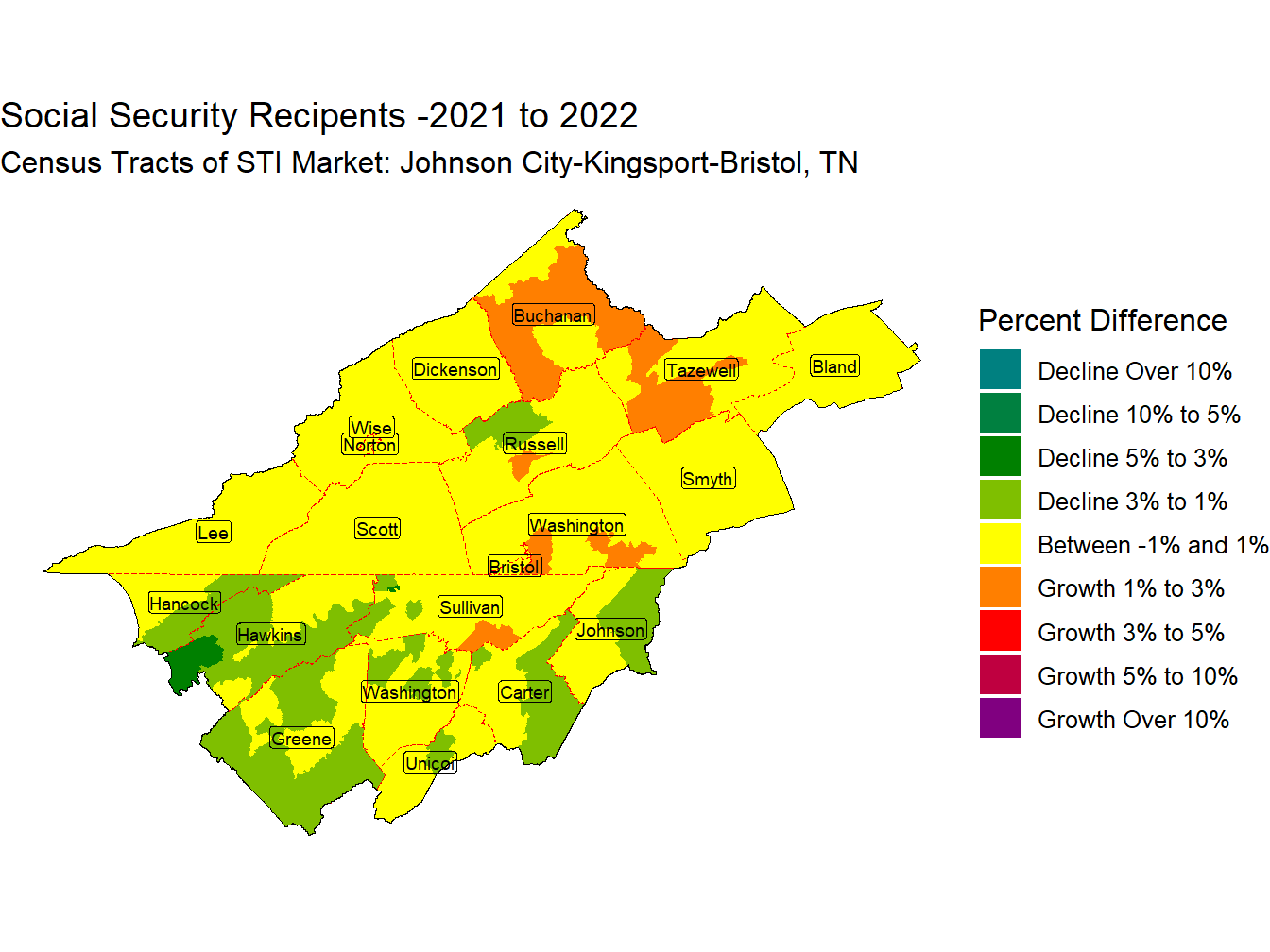 In the Johnson City-Kingsport-Bristol, TN Market, 244,764 out of the Population of 823,032, 29.7%, receive some type of Social Security benefit. This is 1.6 times the National proportion of Social Security Recipients of 18.6%. The market ranks 3rd across STI Markets in the proportion of Social Security recipients.