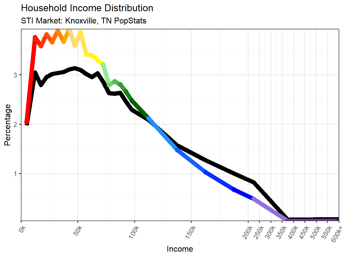 Below the multi-colored line represents the same data for household income in the Knoxville, TN market, but more equally lays out the distribution of population versus the income level, correcting for differences in size of income ranges. You will also notice that after 200k the income ranges are scaled down so the focus is more centered on the more numerous Households making under 200k. The black line represents the National Income Distribution for comparison.