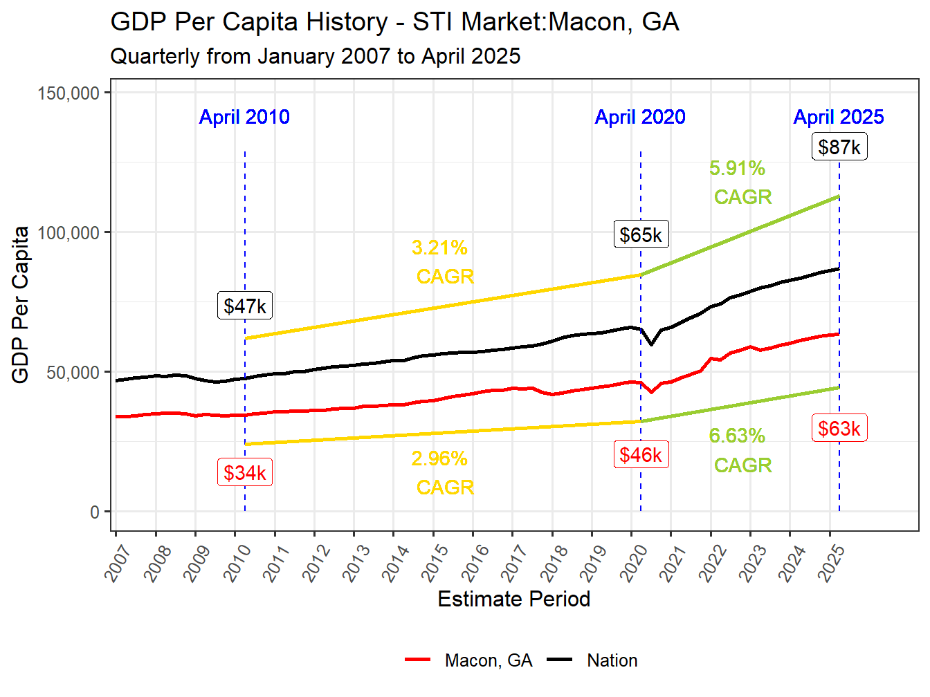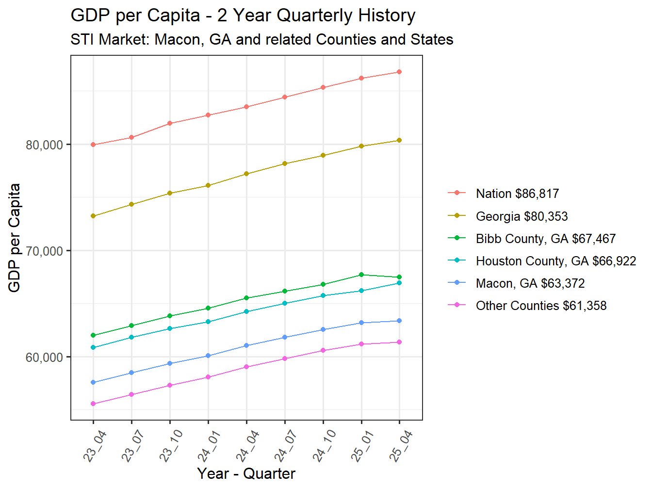 With a GDP of $61.38 billion the Macon, GA Market represents 0.21% of the $29.8 Trillion national GDP. In terms of total GDP this market ranks 110th across STI Markets.