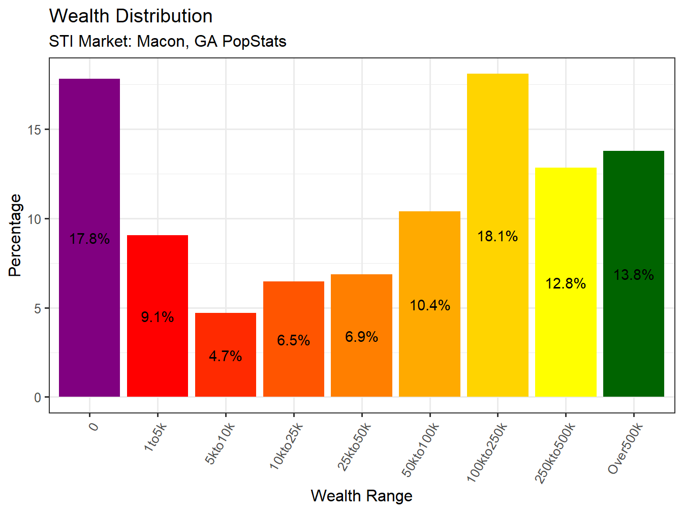 In the Macon, GA Market, 210,537 out of the Population of 968,585, 21.7%, receive some type of Social Security benefit. This is 1.17 times the National proportion of Social Security Recipients of 18.6%. The market ranks 65th across STI Markets in the proportion of Social Security recipients.